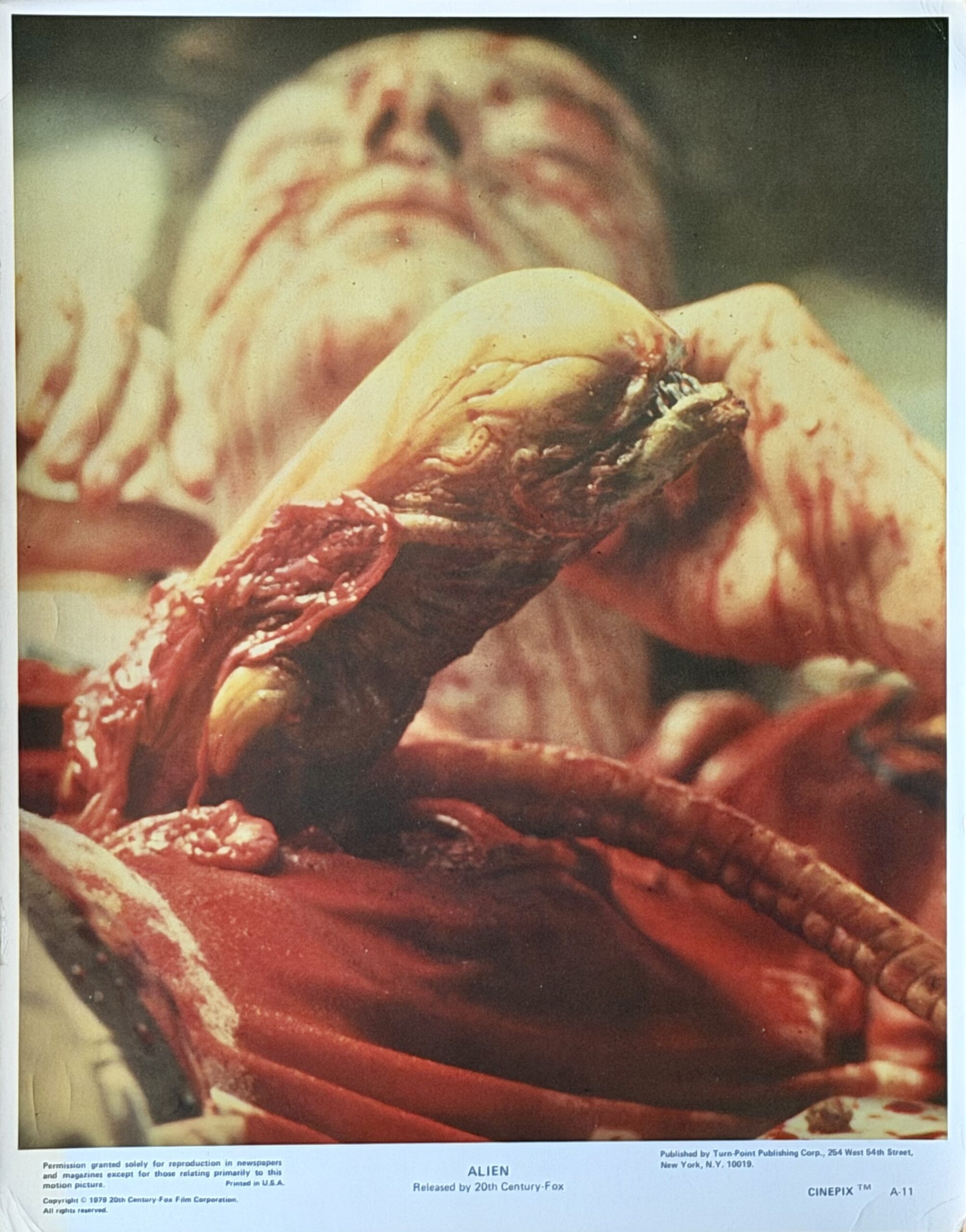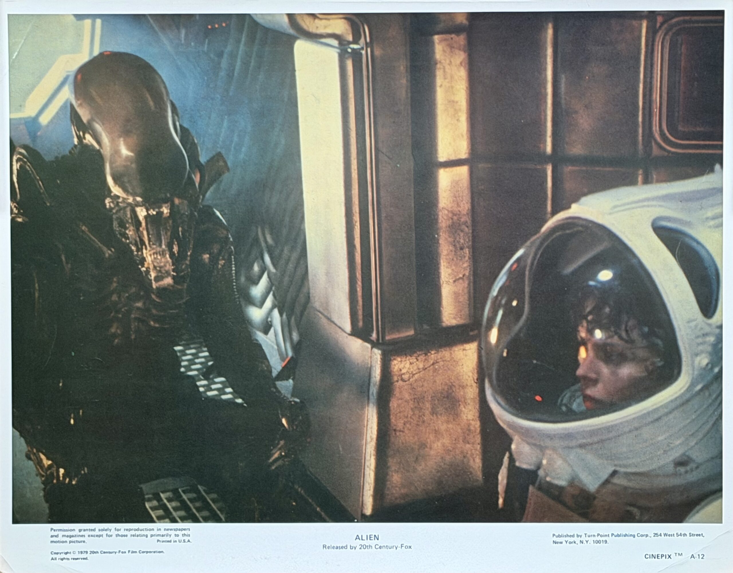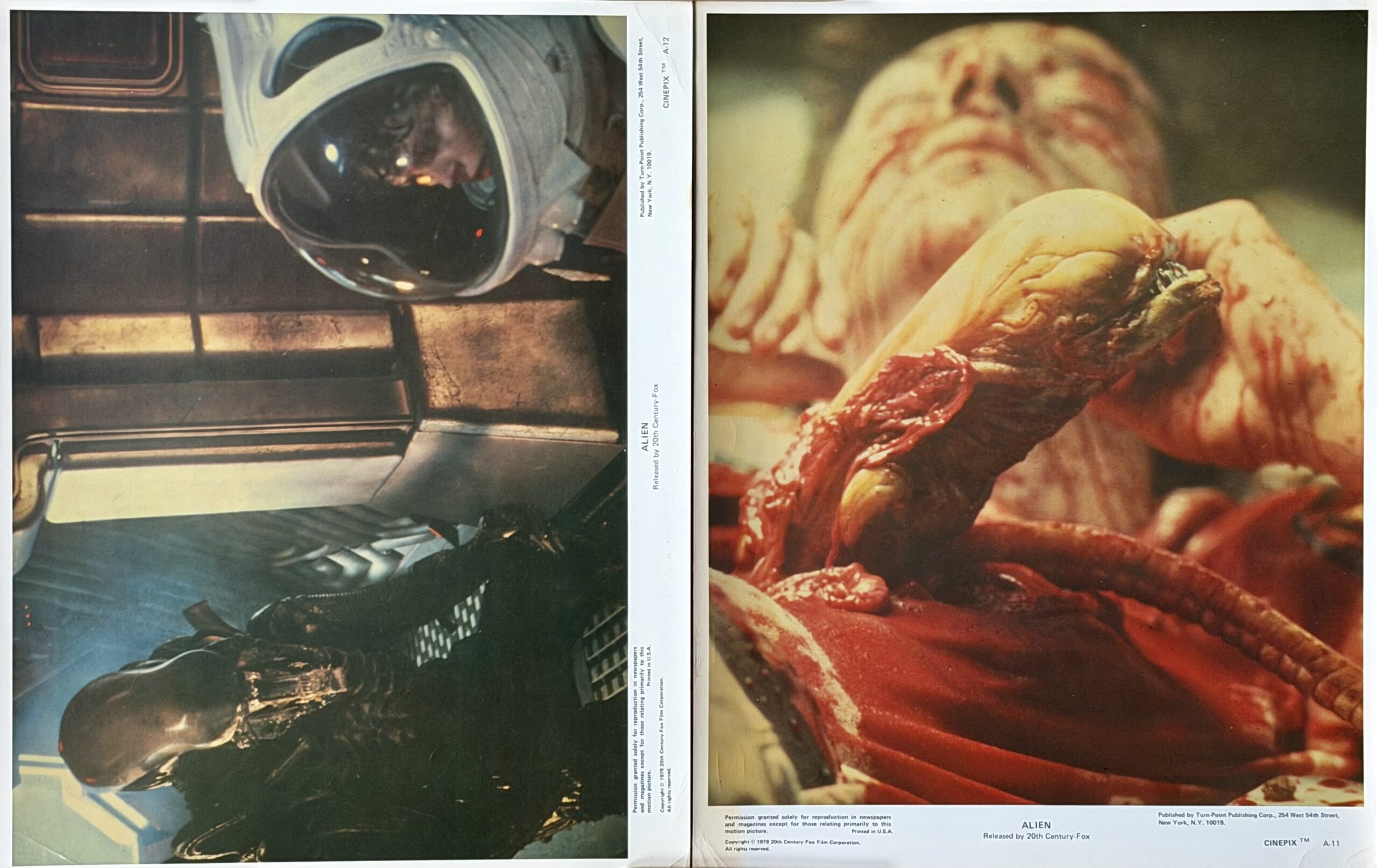 One of cinemas all time classic movies is Ridley Scott’s Oscar winning deep space horror “Alien”. The worldwide marketing campaign is instantly recognisable by the (now) iconic alien ‘egg’ imagery designed by the creative agency Bemis Balkind, and it was accompanied by a wealth of other memorabilia to market the movie. This included fully licensed Studio items, and the two lobby cards available here are first class examples of that high quality officially endorsed material. These are from a special commercial set of two colour prints that was “Published by Turn-Point Publishing Corp.” at the time of the film’s release in 1979 and sold primarily through the sci-fi comic book store ‘Forbidden Planet’. The images chosen couldn’t be more striking- a close up of the iconic chestburster scene as the Alien first appears bursting out of Kane’s (John Hurt) body and as the film reaches its climax the fully formed Alien is about to attack Ripley (Sigourney Weaver). Neither of these images (it would have been a bit of a spoiler) appear in any other lobby card images for the movie. Originally flat and unfolded (as issued) these two cards present and display to very good effect, with only minimal handling wear. Hugely collectable and a fantastic piece of cinematic movie memorabilia from a truly influential movie that changed the face of modern sci-fi horror forever.