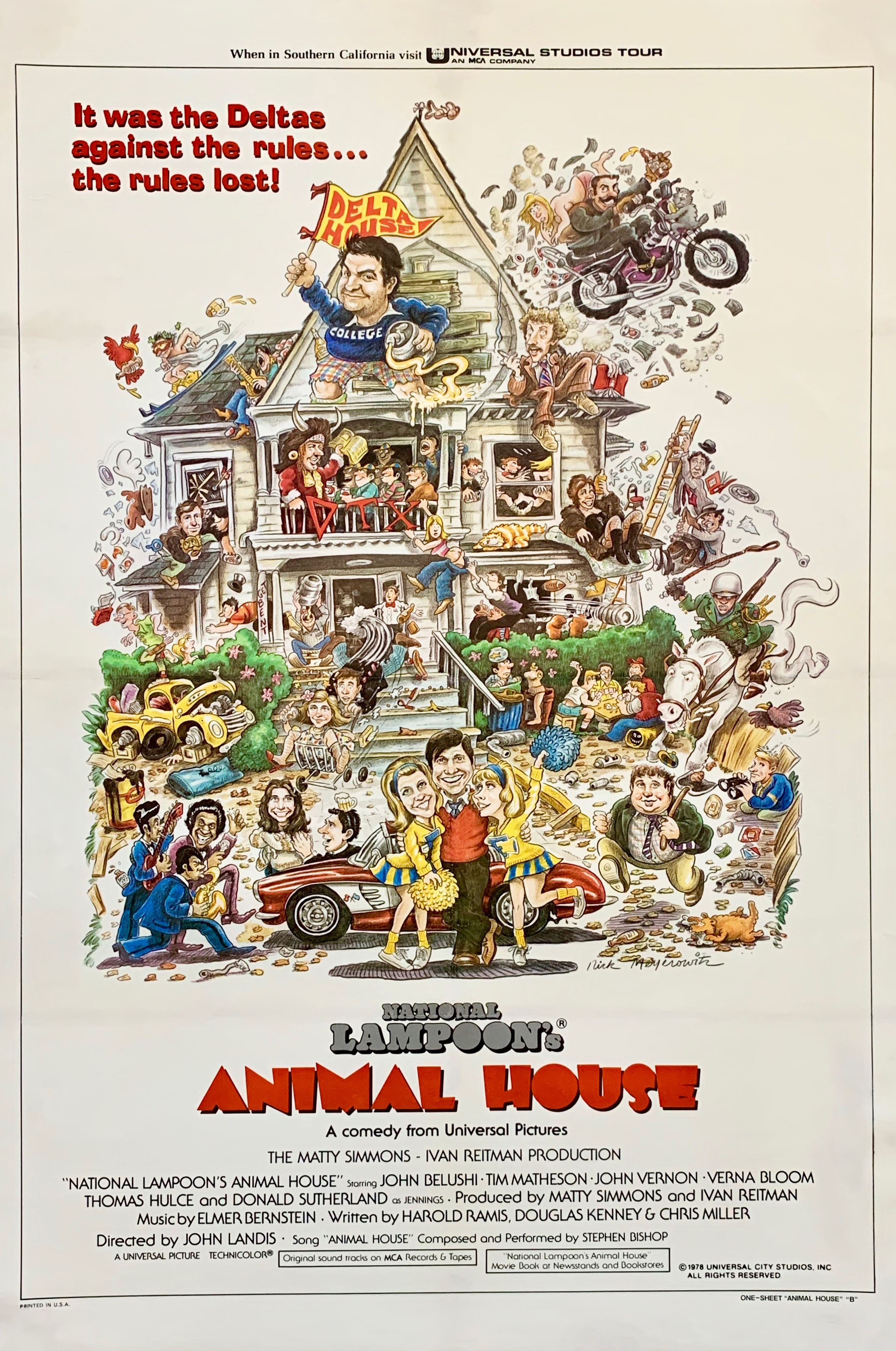 Acclaimed director John Landis marked his debut with one of the best loved and funniest comedy films of all time, the National Lampoon presentation…“Animal House”. From the infamous Toga Party to the Homecoming Parade it is chock full of riotous, laugh out load moments and truly deserves the the accolade of an unqualified cult comedy classic. When originally released in 1978 it was to a rather luke warm reception and like many cult films (The Shawshank Redemption etc.) achieved its huge and loyal following with the advent of home video in the late 70’s. Nick Meyerowitz’ comedic artwork for this Style B US one sheet movie poster is of the highest order as the Delta House and its eclectic ensemble of characters are depicted in all their glory. Originally folded (as issued) this very rare and collectable example has been professionally conservation linen backed and presents very well and represents a fine piece of desirable original movie memorabilia for one the most loved classic comedy films.