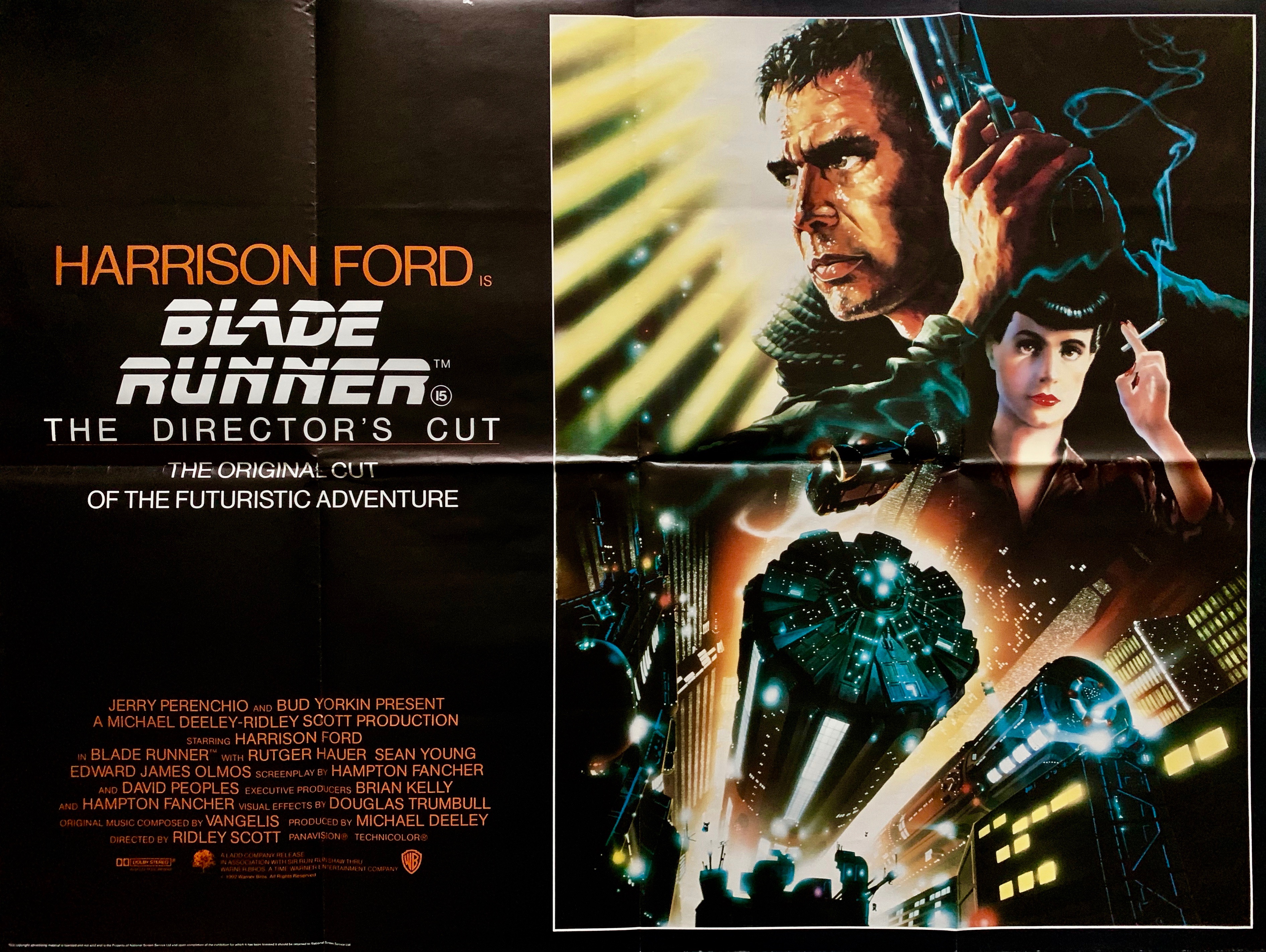 Adapted from Philip K. Dick’s novel Do Androids Dream of Electric Sheep?, Ridley Scott’s “Blade Runner” iconic dystopian classic is unquestionably one of the greatest sci-fi films ever made. And for the 10th Anniversary in 1992 die hard fans and cinema goers had the chance to see it again, at its best on the big screen, when the Ridley Scott released his “Blade Runner: The Director’s Cut” across the UK in a limited number of cinemas. Given that the design of the original 1982 British quad is rather ‘bland’ & uninspiring, John Alvin’s hugely popular US/International style artwork from 1982 was re-imagined and incorporated into the horizontal landscape format of the British quad for this 1992 Anniversary release. The UK quad film poster offered here is unrestored and presented in generally excellent condition, originally folded(as issued) this displays very well with just minor handling wear…A truly fine example of original film movie memorabilia for one of the most influential film’s not just of the sci-fi genre but modern pop culture in general.