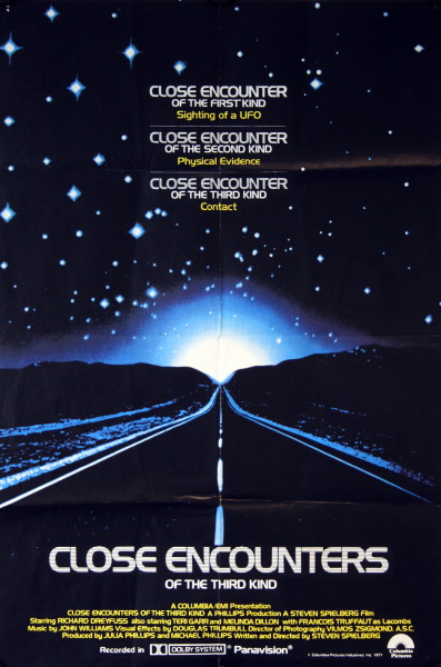 “Close Encounter of the First Kind – Sighting of a UFO. Close Encounter of the Second Kind – Physical Evidence. Close Encounter of the Third Kind – Contact. WE ARE NOT ALONE”…One of the most instantly recognisable movie poster images of all time. This original 1977 British Double Crown film poster for Steven Spielberg’s “Close Encounters of the Third Kind” looks absolutely stunning as presented here. Originally folded this rare example displays very well with deep rich colour. Without the white border (used on the US One Sheet) this full bleed design really does give it a different look & draws you in to the image, giving an almost 3D effect. One of modern Cinema’s truly iconic images !.