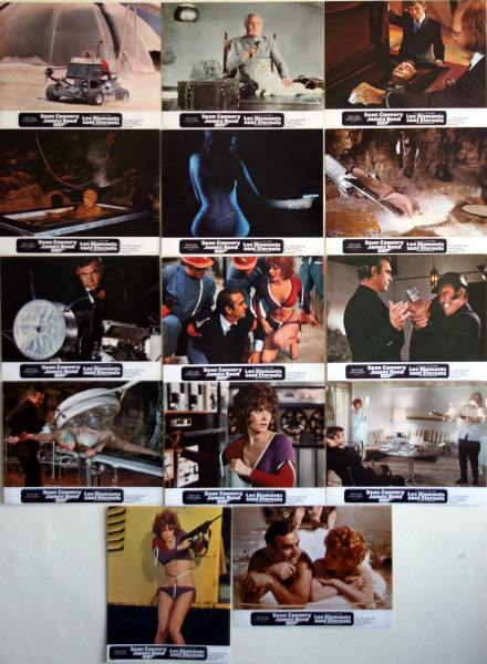 “Diamonds are forever…forever…forever…forever…”…Extremely rare set of ALL 14 French lobby cards from the first year of release 1971 as Sean Connery for the last time (officially) played James Bond 007 in “Diamonds Are Forever” – “Les Diamants Sont Eternals”. Featuring 14 scene cards that are Country unique to France and totally different to any of the US & featuring 9 that are different to the UK. Highlighted by the only card set to feature the moon buggy and a very rare Maurice Binder opening credits shot. Condition of all cards is excellent…RARE INVESTMENT EXAMPLE.