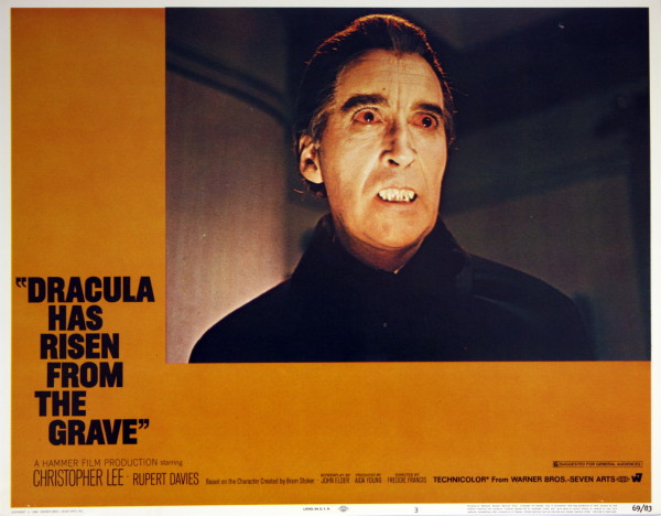 “Inflamed with his Vampire thirst for blood and evil and beautiful girls”…The US Lobby card #3 for Hammer’s third Dracula sequal “Dracula Has Risen From The Grave” is special. The Count in close up…barred fangs and staring bloodshot eyes makes for one of this famous horror studio’s most iconic images (from any film) …Issued flat and presented in investment grade condition this original 1968 lobby card is a very rare example of Hammer Horror memorabilia and one of the best Christopher Lee, Dracula images you will see !…Full set also available.