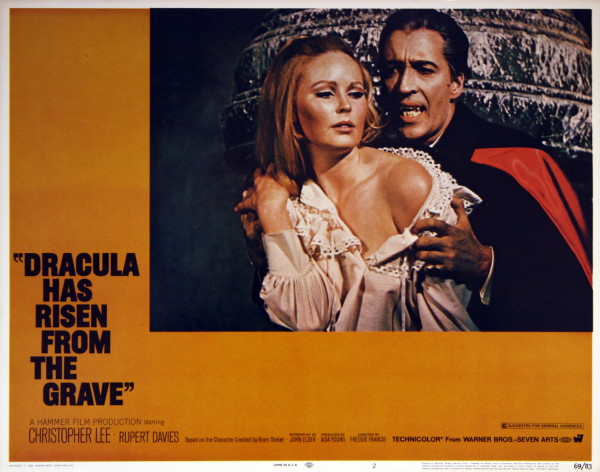 “He lives! They die! Christopher Lee as the fanged undead.”…If a quintessential example of a Hammer Studio’s exercise in Gothic Horror exists, it is probably this film. Not because it is a flawless piece of film-making, far from it. Rather because this film manages to squeeze just about all of Hammer’s horror-show templates into it’s 92 minute running time…Here we have the unmistakeably distinctive set design and music score by Hammer mainstays Benard Robinson and James Benard; romantic leads transposing post Summer-of-Love sexual mores (and hairstyles!) to the film’s indeterminate post Victorian location; two pub locales, one peopled with wary, hostile, superstitious East-Ender types, the other rollicking with high-spirited youthful inebriates; a pious religious figure (and a much less pious one); a cameo by Michael Ripper; day-for-night location shots; attractive women in low-cut bodices and nightgowns; yet another outlandish method of using trickling blood to revive the antagonist; an eventful screenplay that doesn’t measure up to critical evaluation — whew! I could go on and on…Several of the most memorable set-pieces in the Hammer canon are here; the discovery of the girl in the belfry, the attempted staking of Dracula, the Count’s seduction of Veronica Carlson, and his over-the-top demise. These scenes lingered for decades in my mind after I saw the film in the early seventies…One of the harshest critics of this film, incidentally, was it’s star. Christopher Lee, who entered the project enduring serious back pain (stuntman Eddie Powell handled the more strenuous action), disliked the script intensely, especially the attempted staking of the Count. His performance, however, betrays none of his vexation; this is one of his best outings as Dracula. Director Freddie Francis coaxes serviceable performances from the rest of the cast. Rupert Davies and Barbara Ewing stand out, as a noble cleric and lusty barmaid respectively. NSS # 69/83