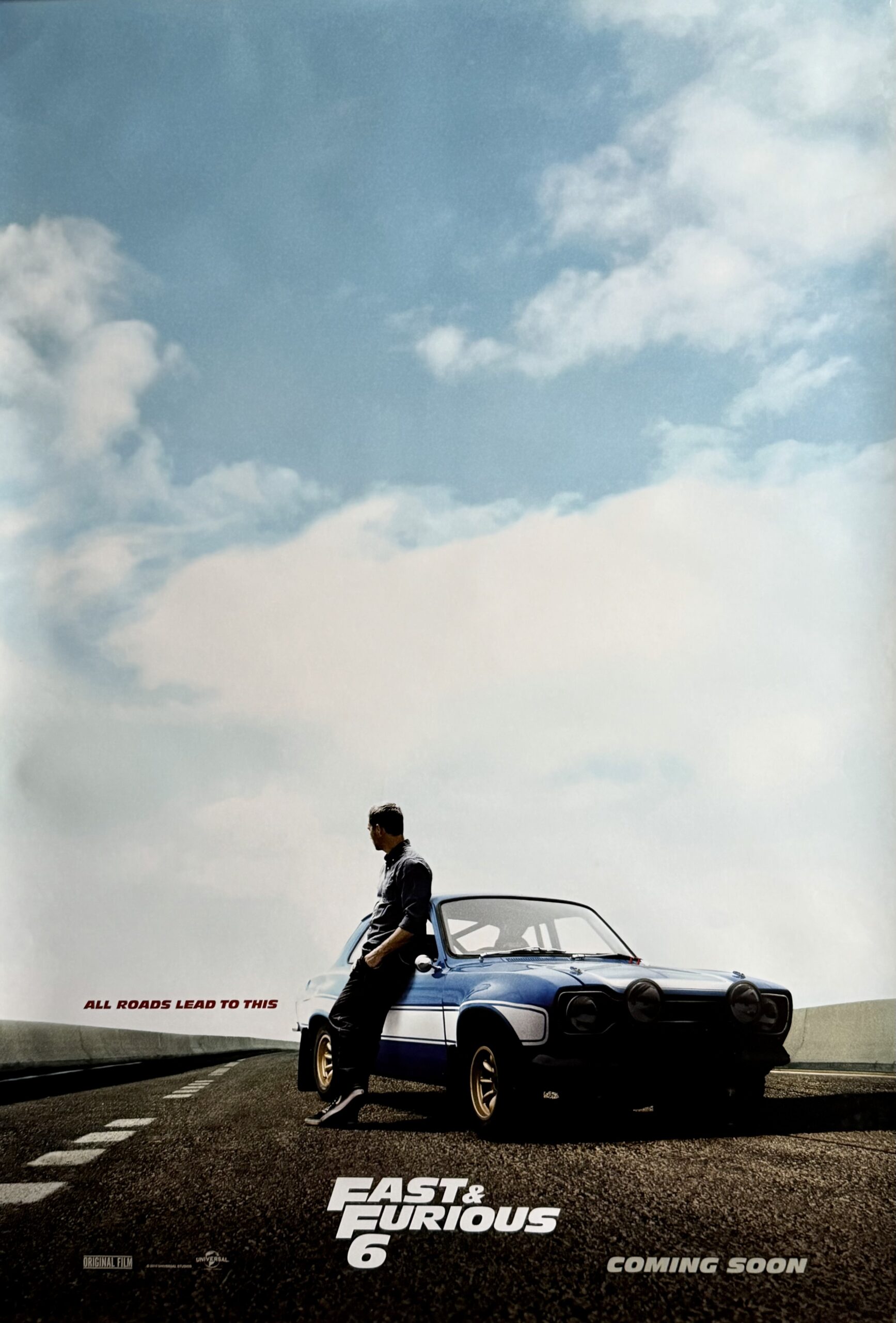 “All roads lead to this”…Very, very COOL – Produced and designed by Cold Open this rare original US one sheet for “Fast & Furious 6” is a great example of modern poster design and artwork; beautifully photographed imagery; on a racetrack, Brian (the late Paul Walker) looking cool lounging against his British classic retro Ford Escort Mexico…Originally rolled (as issued) with a total lack of credits this Advance “Coming Soon” one-sheet displays to excellent effect…“It’s all between you and the car. It’s a bond. It’s a commitment”