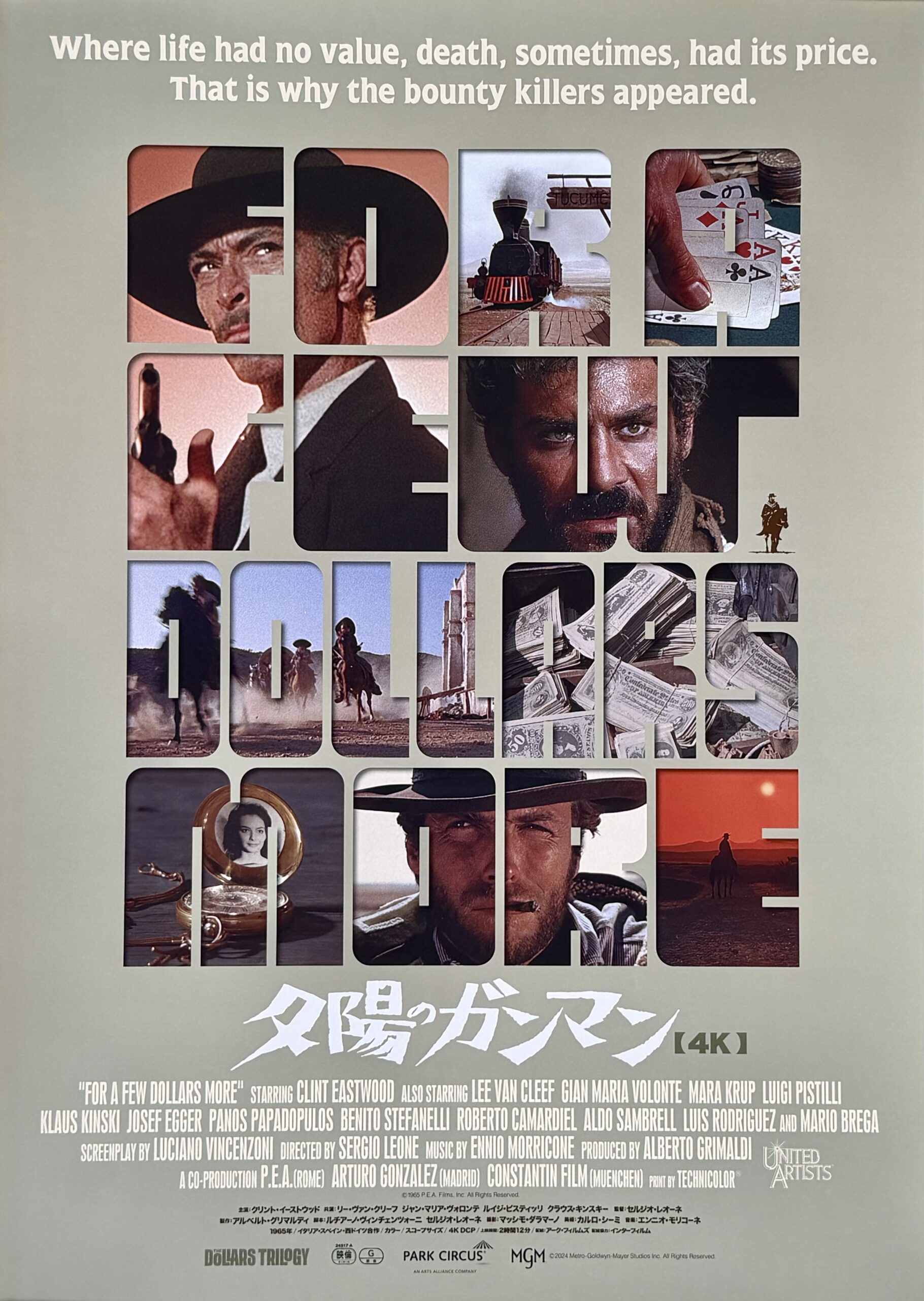 Sergio Leone’s “The Dollars Trilogy” is lauded (rightly so) as the greatest spaghetti westerns ever made with any paper from the films extremely sought after which makes this incredibly scarce 2024 Japanese remastered 4K film festival release for the second in the series – “For a Few Dollars More” a real find. Not only super rare it arguably boasts a clever and stylish poster designs. An eye-catching photo-montage that features the lead characters Eastwood, Van Cleef and Volonte and key scenes shaped into the letters that make up the title. An extremely limited release with a very small print run these posters are a truly collectable ‘modern’ piece of Eastwood/spaghetti western movie memorabilia.