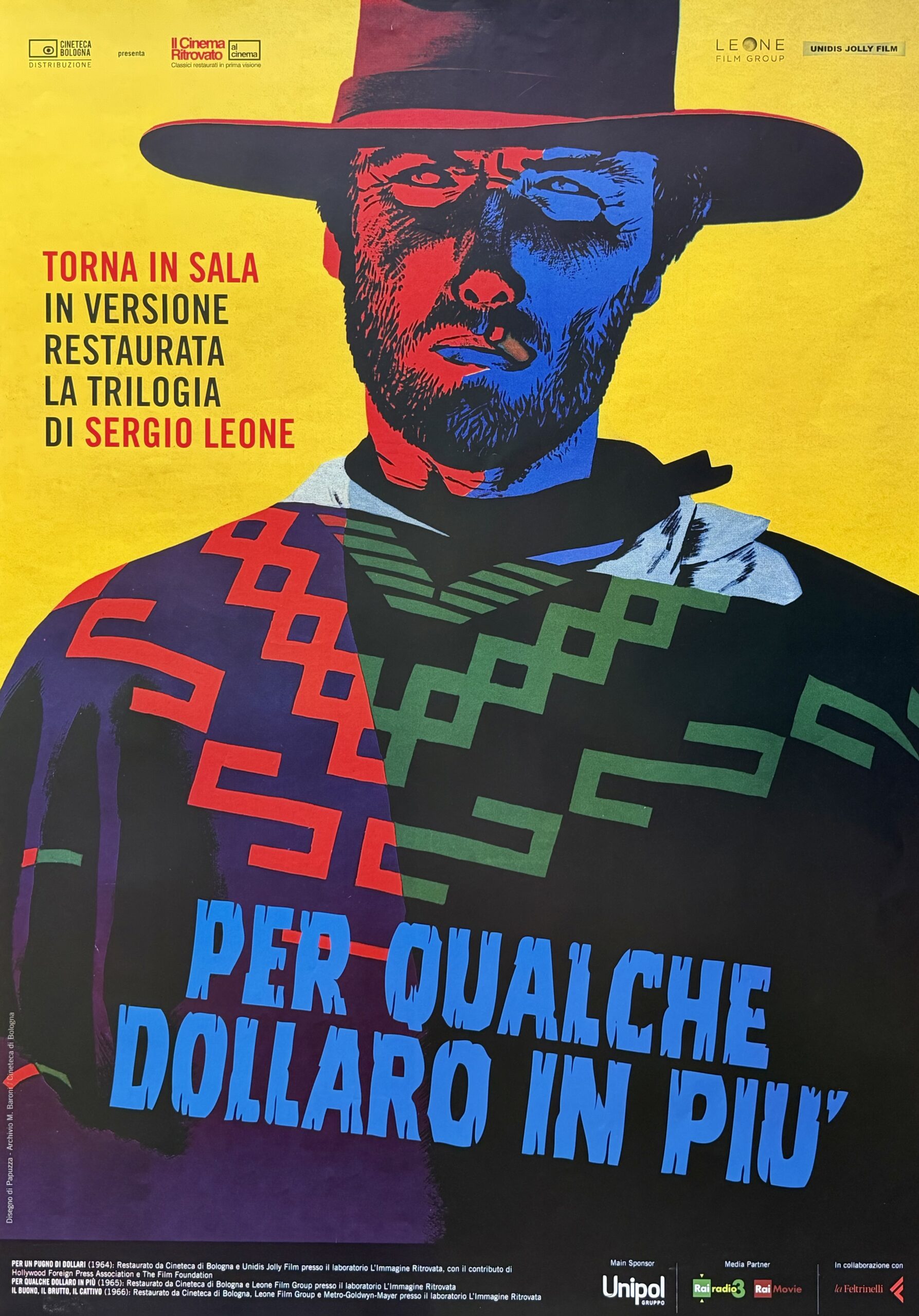 Sergio Leone’s “The Dollars Trilogy” is lauded (rightly so) as the greatest spaghetti westerns ever made with any paper from the films extremely sought after which makes this incredibly scarce 2014 Italian film festival release for the second in the series – “For a Few Dollars More” a real find. Not only super rare it arguably boasts a clever and stylish poster design featuring a colourful pop art style design by acclaimed Italian artist Michelangelo Papuzza. Presented rolled (as issued) this example displays to excellent effect. An extremely limited release with a very small print run these posters are a truly collectable ‘modern’ piece of Eastwood/spaghetti western movie memorabilia.