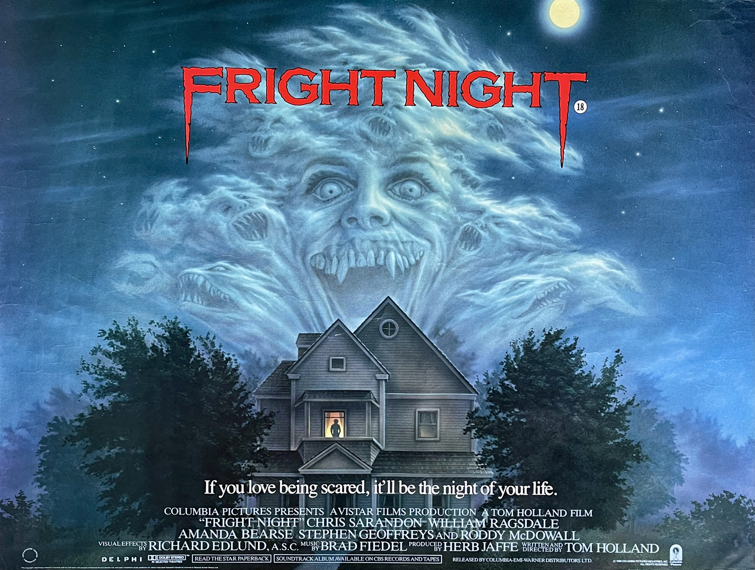One of the stand out horror films of the 80’s & certainly one of the best and most eye-catching posters. This superb UK quad movie poster was designed by B.D.Fox Independent for Tom Holland’s 1985 vampire horror comedy “Fright Night”. The same imagery was used for the global marketing campaign and is particularly desirable in this British landscape format. A hard poster to track down with any paper becoming increasingly scarce. Offered here is an incredibly rare rolled (as issued) totally original unrestored UK quad film poster from first year of release 1985. It displays & presents to excellent effect with really deep colour tones a & stunning horror vampire imagery. A modern horror classic that is a superb piece of original and highly collectable movie memorabilia from one of the seminal films, horror or otherwise of the 1980’s…“Detective Lennox, Jerry Dandridge is a vampire !”