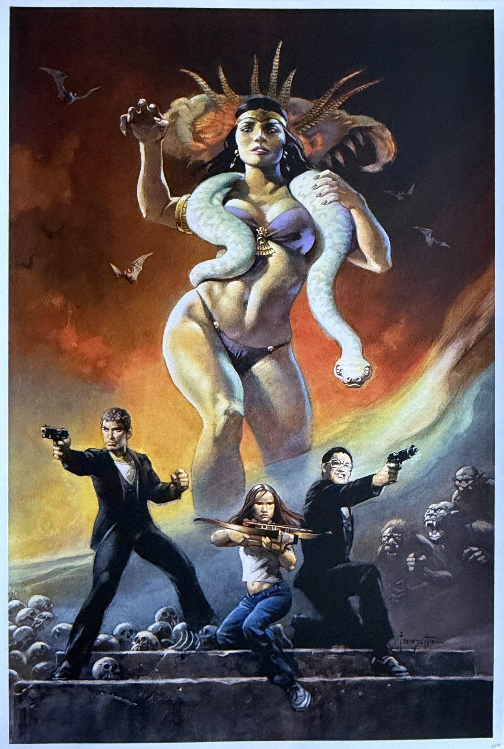 A personal favourite movie and alternative movie poster - Robert Rodriguez' "From Dusk till Dawn" combines vicious violence, Cheech Marin, vampires, and some funny dark humour from the cast into one big collective film. More than a basic horror movie, it shows Rodriquez as a fine director and Quentin Tarantino as a tight screenwriter who bring to the screen shoot em up vampire fun for the Pulp Fiction/Evil Dead devotees. A fantastic interpretation by Frank Frazetta for this grindhouse, horror-heist collaboration that perfectly captures the feel, look and attitude of the movie. Visual impact and artistic design are key aspects of any Tarantino/Rodriguez production and this beautiful example perfectly illustrates that fact, as a super-sexy Santanico Pandemonium (Salma Hayek) dominates the imagery. Legendary artist Frank Frazetta originally painted this art as a poster concept in 1996 after being personally (Rodriguez is a huge Frazetta fan) commissioned by Robert Rodriguez himself. Absolutely stunning, the photograph really doesn't do this example justice - being a giclee print (see below) with colour separations by Jason Edmiston the vibrant colours pop from the paper as this 2022 hand-numbered (#16/70) art print displays and presents to excellent effect and represents an amazing piece of cult cinematic movie memorabilia.