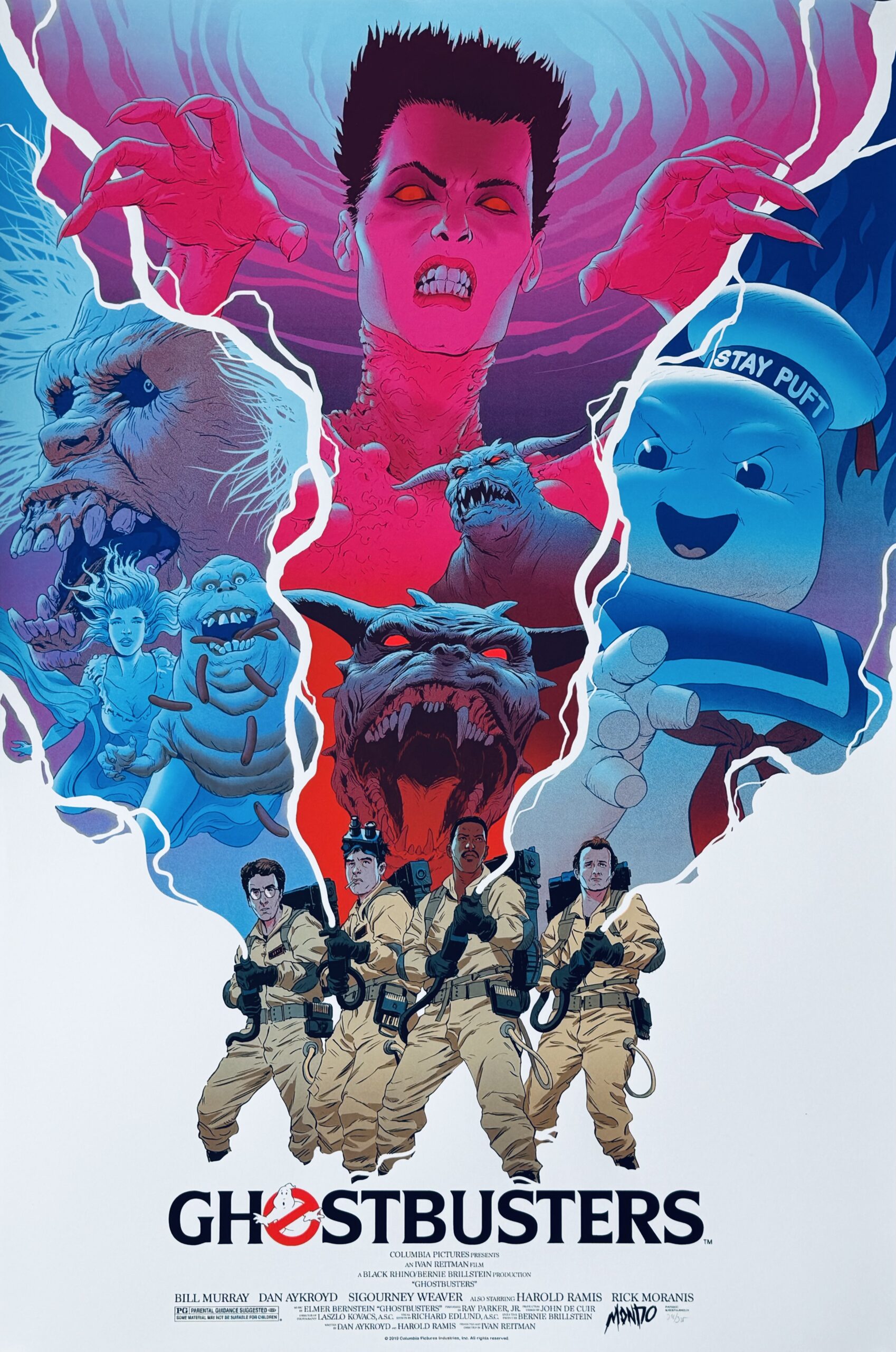 One of the best must hummable theme tunes and a truly apocalyptic finale, it is no surprising that “Ghostbusters” was the biggest film of 1984. A supernatural summer blockbuster with humour, thrills, spills and some of the best special effects money could buy at the time. Ivan Reitman’s masterpiece is a much loved genuine classic that has been complemented by a series of alternative movie posters and in 2019 Mondo commissioned leading artist – Robert Sammelin to create his version. Sammelin has produced an outstanding addition to the title, truly eye-catching and super stylish as Gozer the Gozerian and the Stay Puft Marshmallow man take centre stage in the streams of the Ghostbusters’ proton packs. Originally rolled (as issued) this looks and displays to excellent effect being hand-numbered #311/325. An extremely scarce example and an impressive item of collectable film movie memorabilia from one the best movies to come out of the 1980’s.