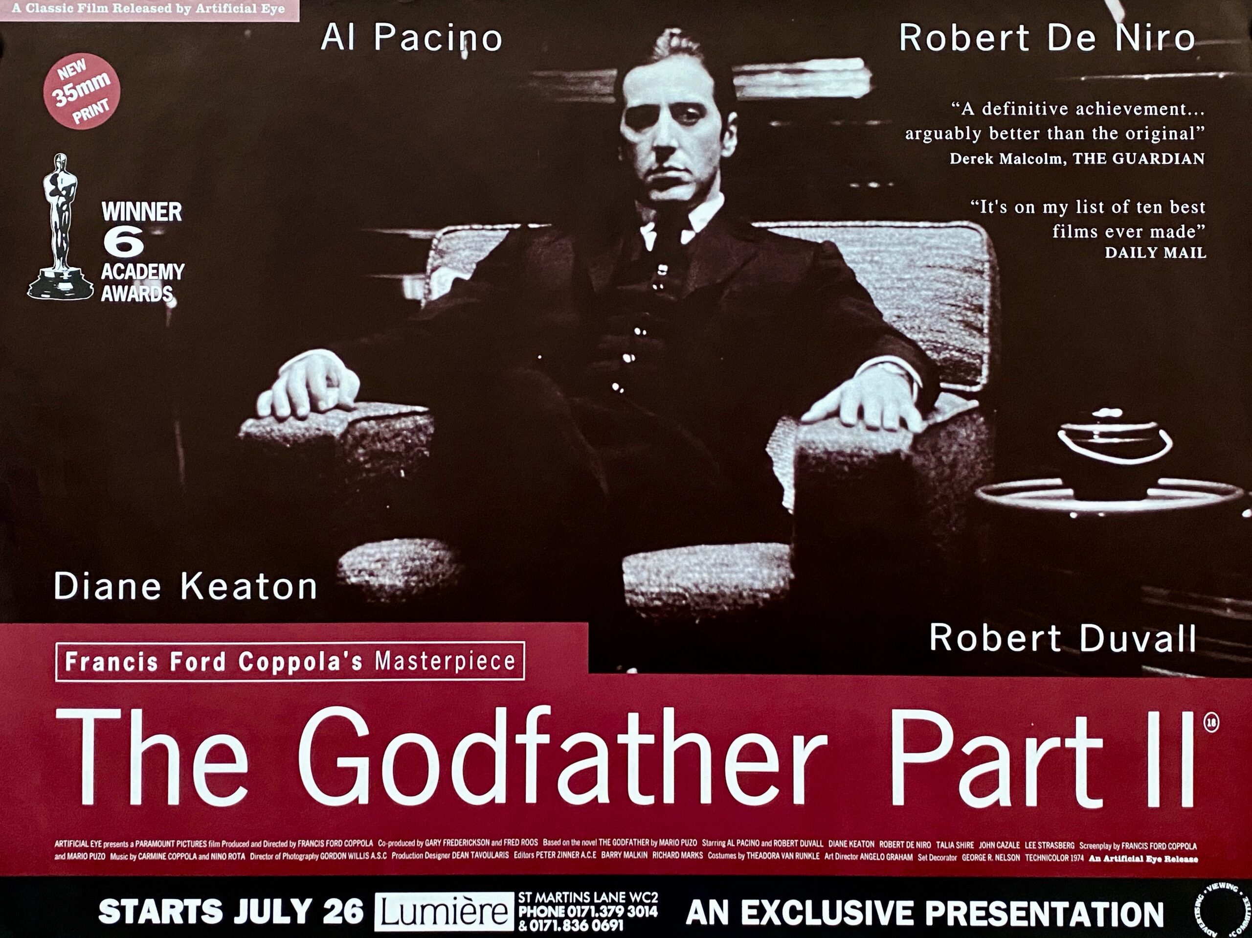 The second part of Francis Ford Coppola’s Epic and violent Gangster Trilogy “The Godfather: Part II”, follows the reign of ‘new’ Don, Michael Corleone as the head of the Corleone family. The film shows us the early years of Vito Corleone (Marlon Brando) played flawlessly by Academy Award Winner Robert De Niro, and how he created his empire of money, gambling and respect. Th example offered here is from a limited British re-release in 1996. Beautiful looking and well designed with simple black and white main imagery featuring a thoughtful Al Pacino in a key scene from the movie as he plots his rise to power in the ‘Family’ study. Because of the small number of cinemas screening the movie this is a very hard to find poster. This example displays to excellent effect and is presented in original unrestored rolled condition. An outstanding piece of movie memorabilia. The film series is a phenomenon, an exquisite Mafia epic with outstanding performances, Coppola got everything right, creating a cinematic event with an immeasurable influence on everyday culture and life.