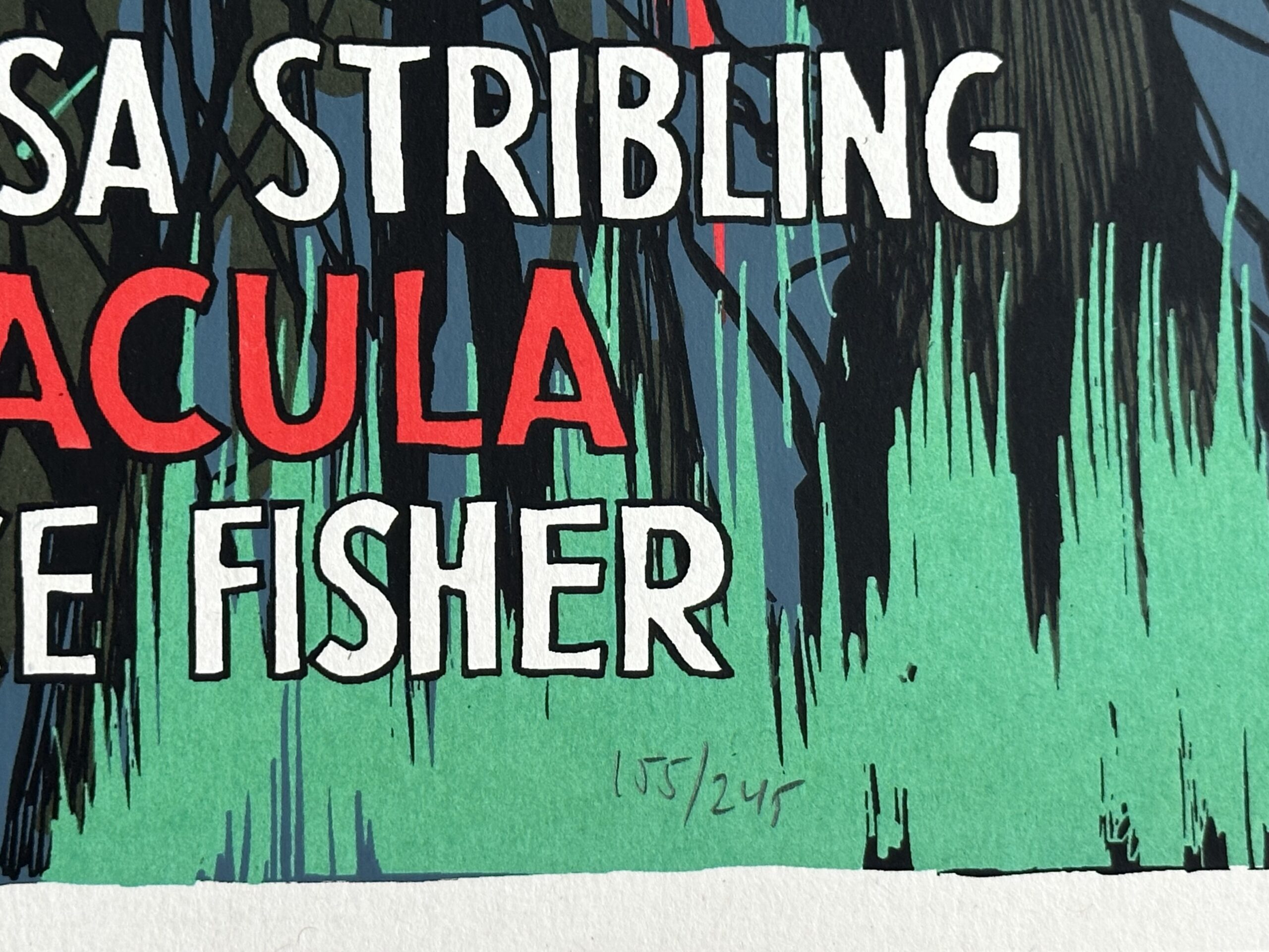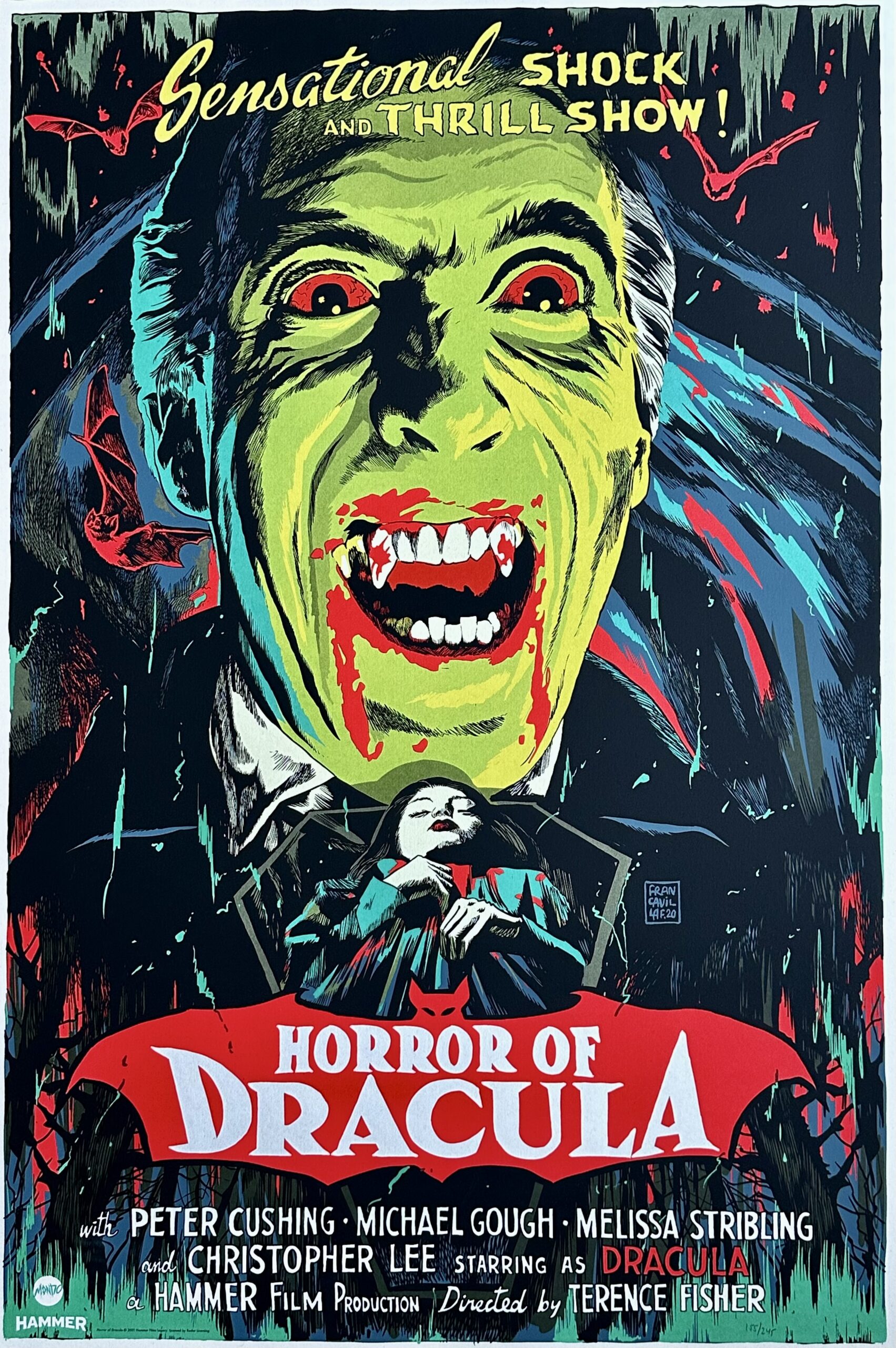 Officially licensed by Hammer and released in 2021 as a San Diego Comic Con exclusive, this incredible limited edition alternative movie poster for the classic “Horror of Dracula” features the distinctive artistic style of Francesco Francavilla. The photograph really doesn’t do justice to this art print, the colours are bold, appearing newly painted with Christopher Lee (Count Dracula) prominent with blood stained fangs barred and his face bathed in an eerie green colour tone. Hand-Numbered #155 from a print run of 245 it is presented in excellent condition. This high quality modern art print displays superbly and represents an extremely desirable and collectable item of British Hammer horror movie memorabilia.