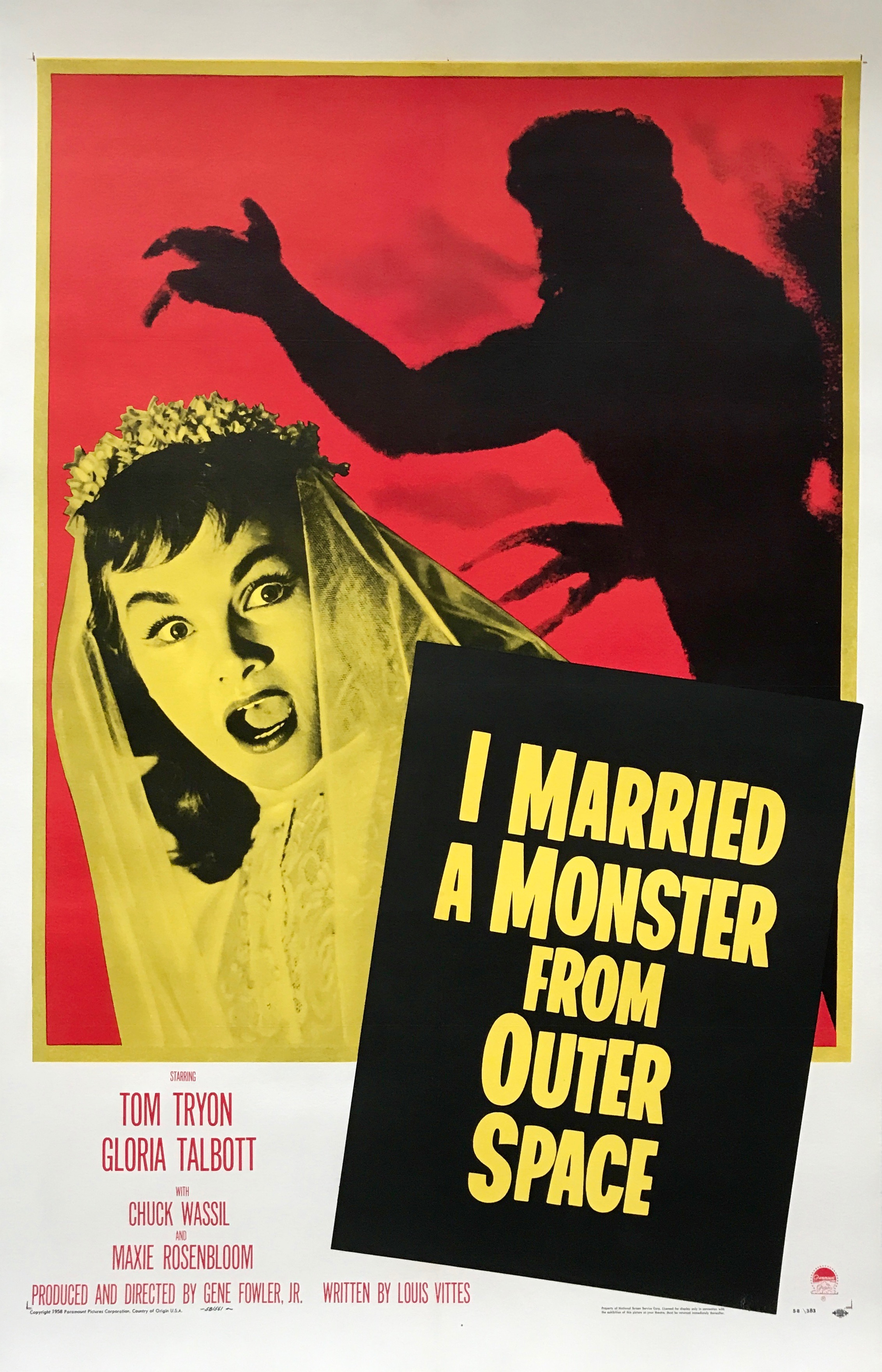 Ok, be honest we’ve all thought we’d married one at some point in our lives, but in 1958 it all started with this…Gene Fowler Jr’s classic sci-fi B movie “I Married A Monster From Outer Space”. A classic drive-in favourite and very underrated thought provoking film (due possibly to the kitschy title) from the 1950’s sci-fi / horror era and certainly one of the most striking posters as Gloria Talbott, dressed in her finest white wedding dress recoils in horror from the alien shadow. This outstanding country of origin 1958 US one sheet was originally folded (as issued) and has now been conservation linen backed to a very high standard. With incredible colours and distinctive design it presents and displays superbly being immediately ready to frame. A scarce example of an instantly recognisable much loved sci-fi B movie poster that represents a sought after item of highly collectable original movie memorabilia…“The Bride Wore Terror !”