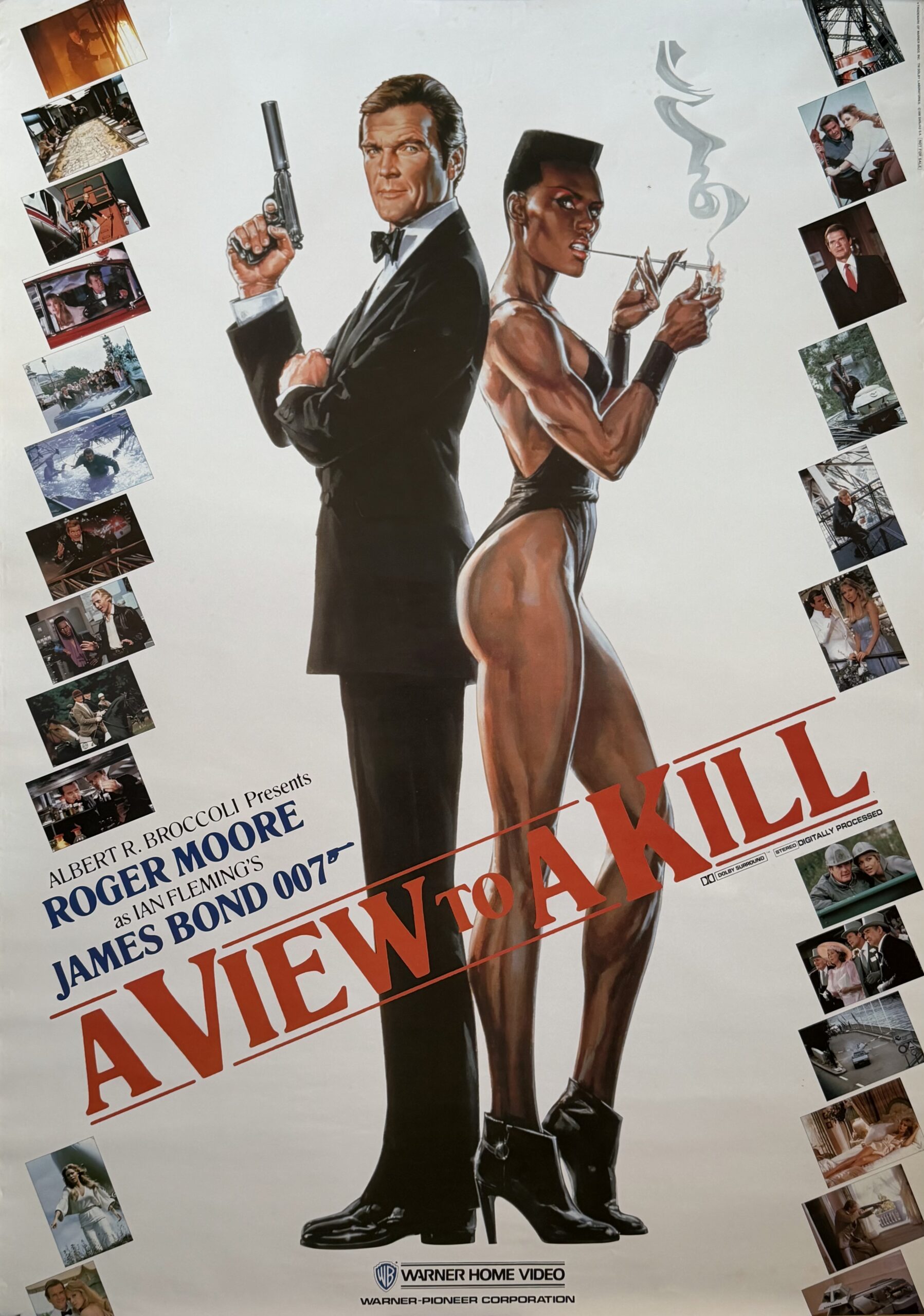 Roger Moore’s final outing as 007 sees Bond artistic maestro Daniel Goozee produce a truly stunning series of posters for John Glen’s “A View To A Kill”. And it is his advance teaser design featuring Roger Moore as 007 and Grace Jones as Zorin’s henchwoman May Day that has been adapted for this Japanese video release B1 poster – the likenesses of both Moore and Jones are incredible. Very rare in this larger Japanese format with a design unique to Japan as key scenes have been added the left and right borders. These don’t turn up very often especially in this excellent unrestored, originally rolled (as issued) high grade condition. It presents and displays superbly and represents a fine example of a scarce and extremely collectable James Bond vintage movie memorabilia.