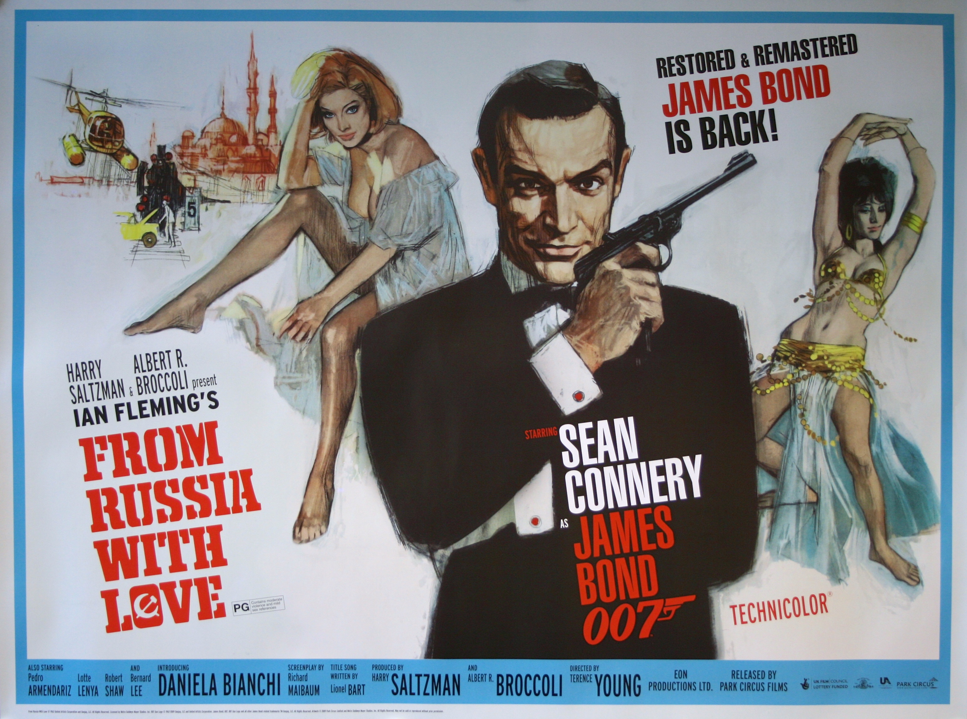 “To those unlucky few who missed “DR. NO”…You are unprepared for the sophisticated mayhem and the polished lovemaking. The James Bond bug has not bitten you. But take heart! There is still time to jump on the Bond bandwagon with the second James Bond adventure…FROM RUSSIA WITH LOVE. See it and we guarantee – you will be hooked for good !”