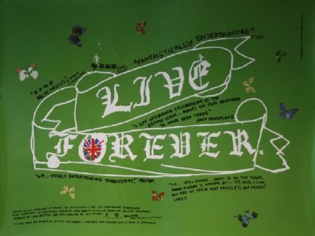 “The truth behind the myths”…Acclaimed artist Damien Hirst designed this striking UK quad movie poster for John Dower’s Brit Pop documentary “Live Forever”. This rolled example is in exceptional condition and displays superbly. A real eye catching, talking piece poster for a movie that quickly became a cult classic. Genuinely scarce and in very short supply due to its print run of only 1,500 copies and very limited cinema release.