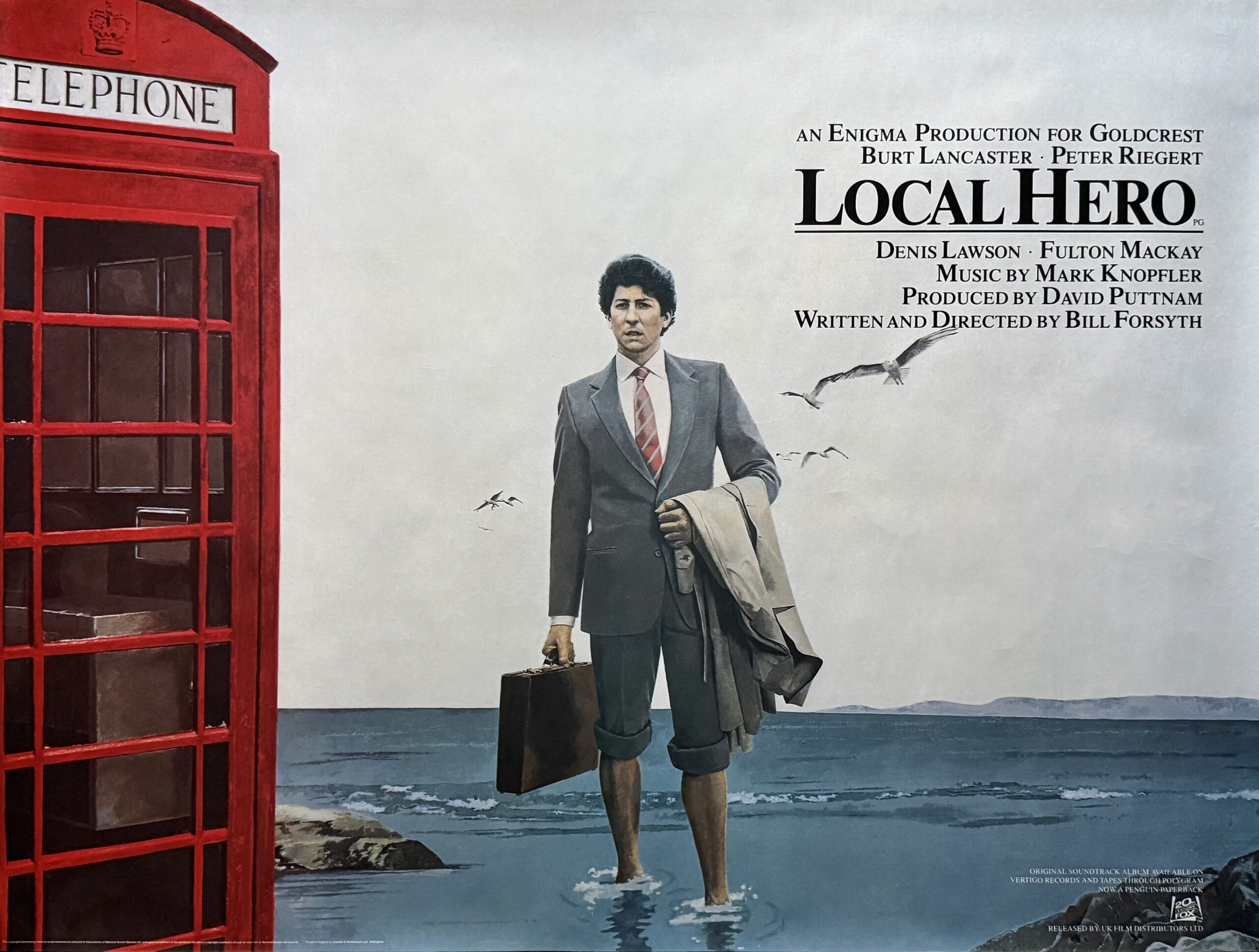 A British UK quad film poster for Bill Forsyth’s 1983 feel good comedy “Local Hero” starring Burt Lancaster as the oil billionaire Felix Hopper and Peter Riegert as Mac, the executive sent in to seal the deal. And it’s both leads who feature on this beautiful one-sheet. The artwork is really quite stunning and sadly unattributed.This romantic comedy has gained a certain cult following over the years and has withstood the test of time very well. Genuinely heart warming and as a poster a rare find. Originally rolled (as issued) this unrestored example displays and presents to excellent effect. Hugely popular with a large and loving fan-base the original film poster offered here represents a a very collectable piece of British (well Scottish) movie memorabilia.