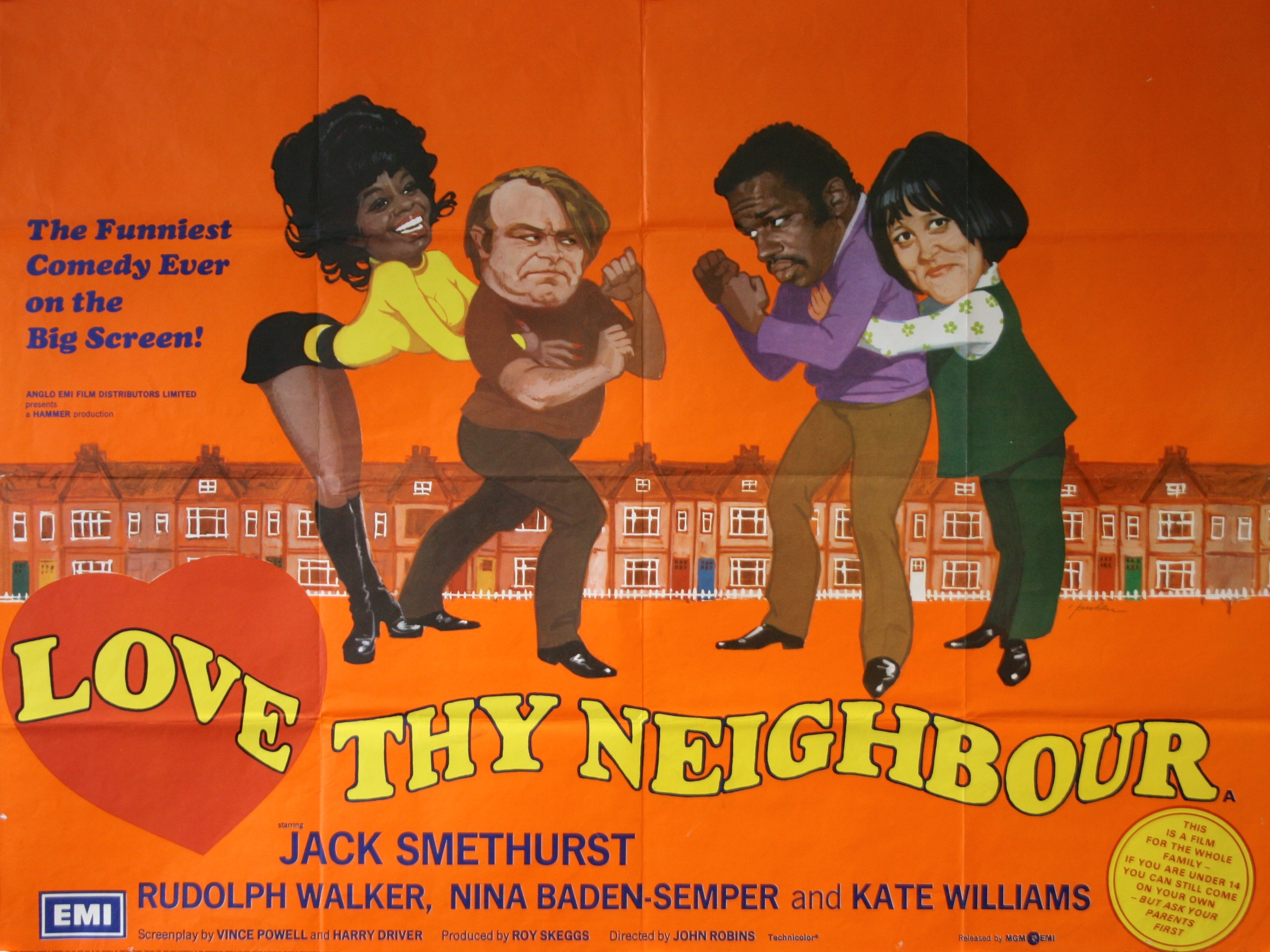 “I’ll ave arf! “…Definitely one of the boldest and most colourful film posters of the 1970’s. as Hammer Productions (yes, that Hammer) more famous for its horror output that TV comedy employed the artistic talents of Arnaldo Putzu to produce the poster for the 1973 comedy “Love Thy Neighbour”. This was trademark Hammer merchandising; forget about the content let’s just put bums on seats and the best way to do that was to produce a really eye catching image that would draw the audience in. Putzu has done a marvellous job with great caricatures of the main characters. A great fun, very colourful poster capturing the very essence of the hugely succesful TV series. Originally folded (as issued) this excellent example looks superb…Easily the most politically incorrect of any TV comedy shows it must however be viewed in context and regarded as a classic British comedy of the period. Because of the controversial subject matter posters from this film are genuinely rare; this original film poster is certainly a snapshot of the time.