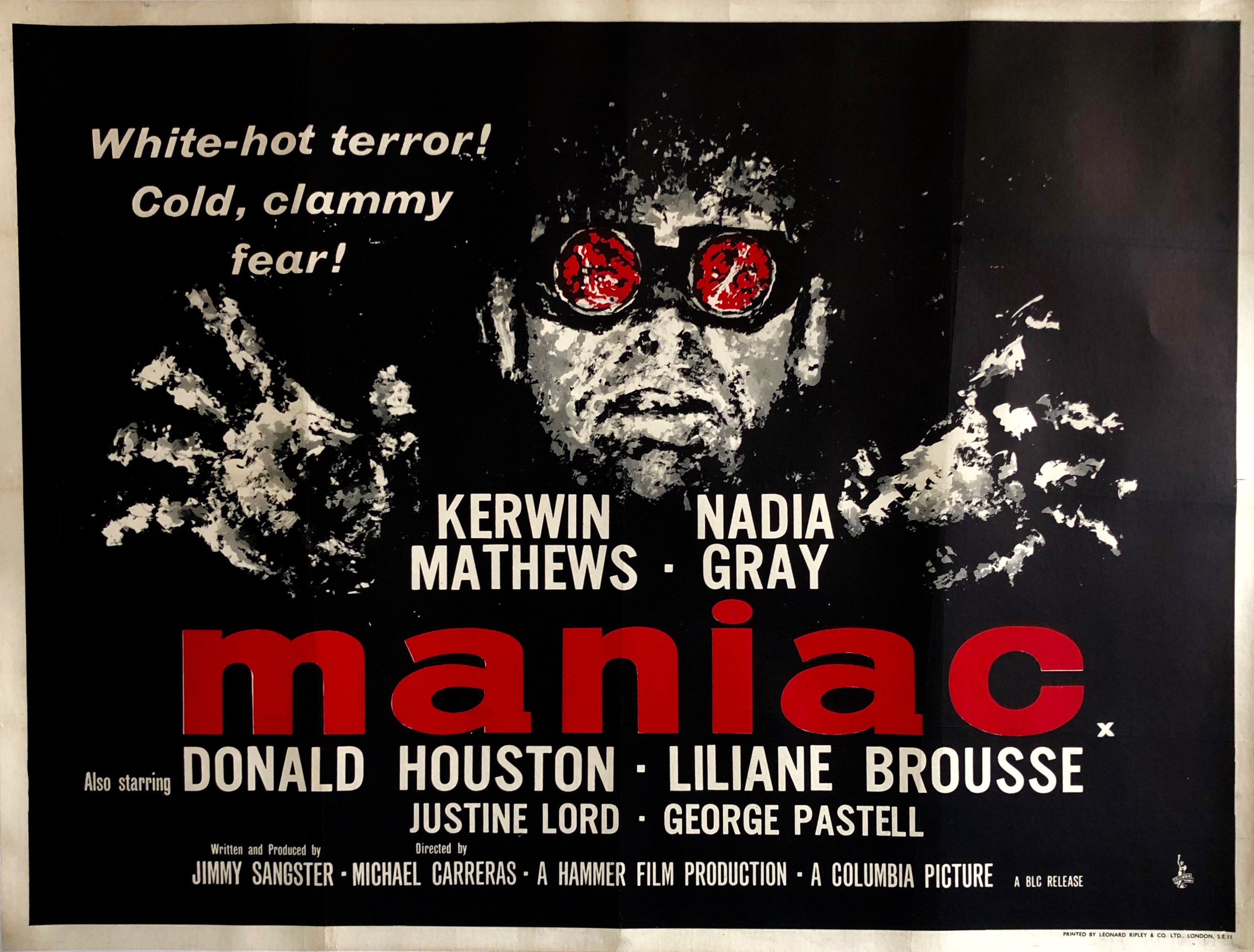 Featured in Marcus Hearn’s excellent tome “The Art of Hammer” this original 1963 British quad film poster for Hammer Films’ “Maniac” is indeed a very rare find. One of the scarcest standalone UK country of origin posters from the iconic horror studio and a must-have for collectors. Striking, bold artwork that was way ahead if it’s time in terms of design. Black, grey & red colours against a dark black background produces truly memorable imagery…In really beautiful restored condition this originally folded (as issued), example presents and displays superbly after being conservation linen backed. A magnificent and historically important piece of early Hammer Horror memorabilia that is hugely collectable and desired. At time of writing this is the only example currently being offered for sale with the last recorded auction sale being in 2006…very, very scarce.