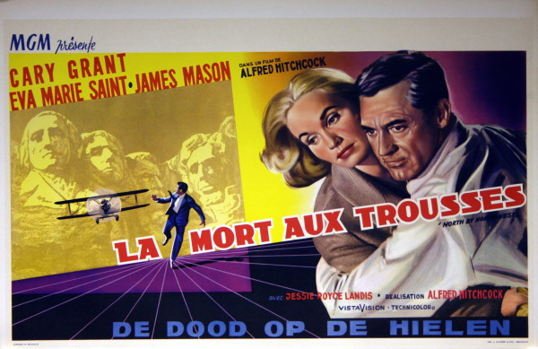 Regarded (& rightly so) as one of the finest Alfred Hitchcock film posters. This beautiful Belgian One Panel for his 1959 thriller “North By Northwest” (“La Mort Aux Trousses”) is outstanding example of Belgian artwork, with a design unique to this release. Whilst US audiences had the now classic Saul Bass designs on most of Hitchcock’s posters this imagery remains an equally memorable piece. Painted art with deep, rich colour featuring Cary Grant And Eva Marie Saint and the classic “crop-duster” scene with Mount Rushmore as a dramatic backdrop. All contribute to make an exceptional classic film poster presented in excellent unrestored original condition and a fine piece of Alfred Hitchcock cinema memorabilia.