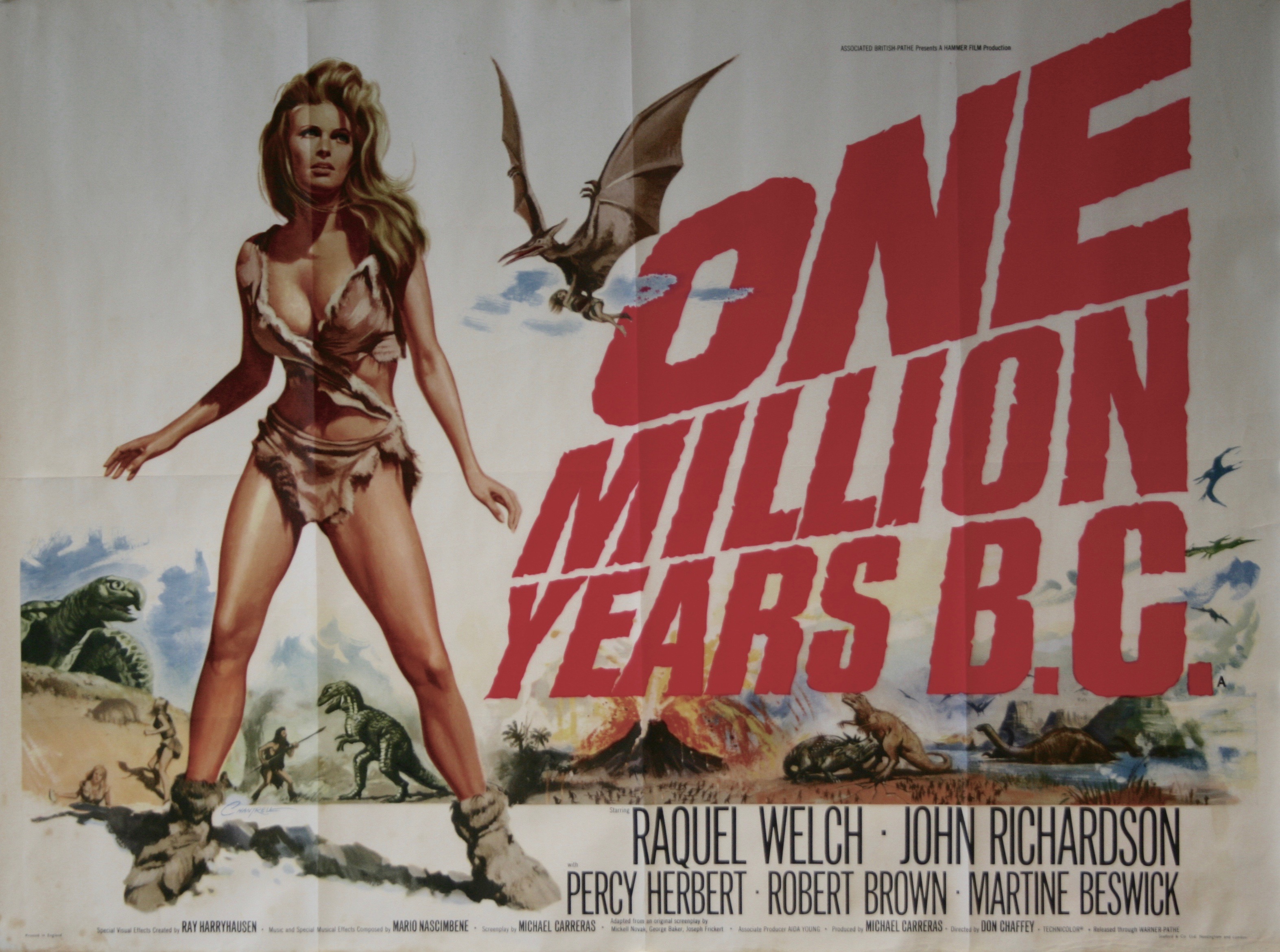 The most iconic of all Hammer posters features the quintessential image of Raquel Welch at her peak. Designed and illustrated by Tom Chantrell, Welch’s clad in fur-bikini image formed the centrepiece for arguably the most successful marketing campaign in Hammer’s history. Extremely scarce this is a country of origin example ‘full size artwork’ (Another version exists with smaller imagery which was used by the ABC cinema chain with the backup feature The Bugs Bunny Show) UK quad film poster from first year of release 1966. Totally original and unrestored this sought after example needs to be seen in the flesh to be fully appreciated. Originally folded (as issued) this exceptional poster has stood the test of time well and displays to very good effect…The vibrant bright pink lettering really zings from the paper (apologies but this doesn’t really come across in the photograph). One of the best examples of British movie poster artwork ever produced; a real personal favourite. Incredibly collectable it represents one of the most desirable film posters ever produced and a fine piece of iconic movie memorabilia.