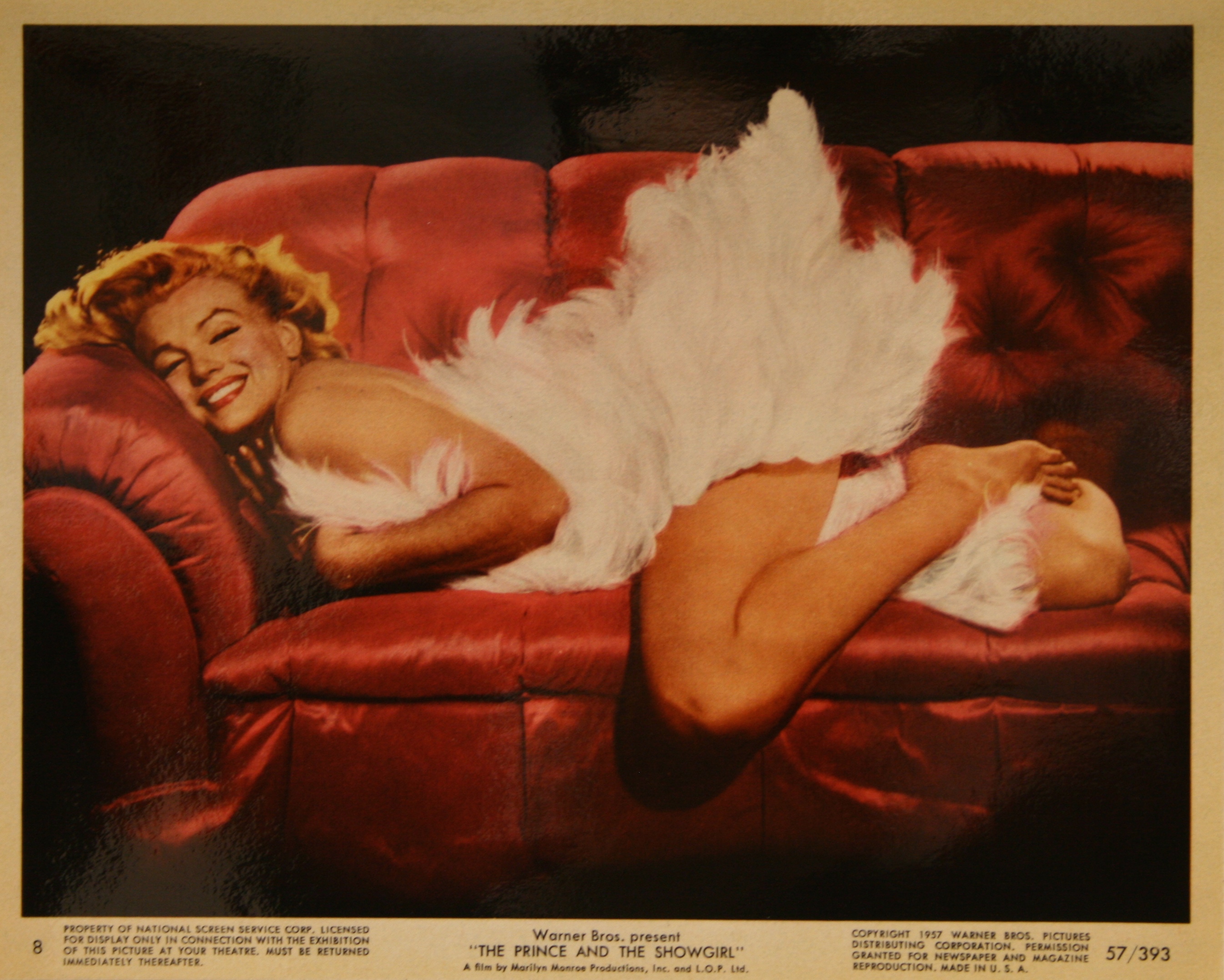 “Some countries have a medal for everything.”…One of the best and most recognisable images of Marilyn Monroe; a very sexy smiling Marilyn posing on bright red couch (if you look closely the red of her lipstick matches the couch) dressed only in white feathers. This original 1957 US front of house lobby card no.8 for “The Prince and the Showgirl” is flawless, coming from an unused faultless set of stills. Unlike the usual larger US lobby cards that have a flat, matt finish these front of house cards are extremely glossy. This high gloss finish certainly enhances the overall look and effect of the card; Marilyn at her sexiest, glamorous best. Perfect for any fan of the immortal screen goddess who wants the best available.