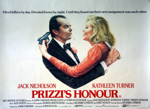 “Hired killers by day. Devoted lovers by night. Until they found their next assignment was each other”…Beautiful rolled UK Quad film poster for John Huston’s 1985 romantic gangster based black comedy “Prizzi’s Honour” starring Jack Nicholson & Kathleen Turner as the loved up mob assassins. You would be hard pushed to find a nicer example of this (if you could find one at all). Originally rolled with great artwork and deep unfaded colours this displays superbly, looking absolutely fantastic in this landscape format presented here in investment grade condition.