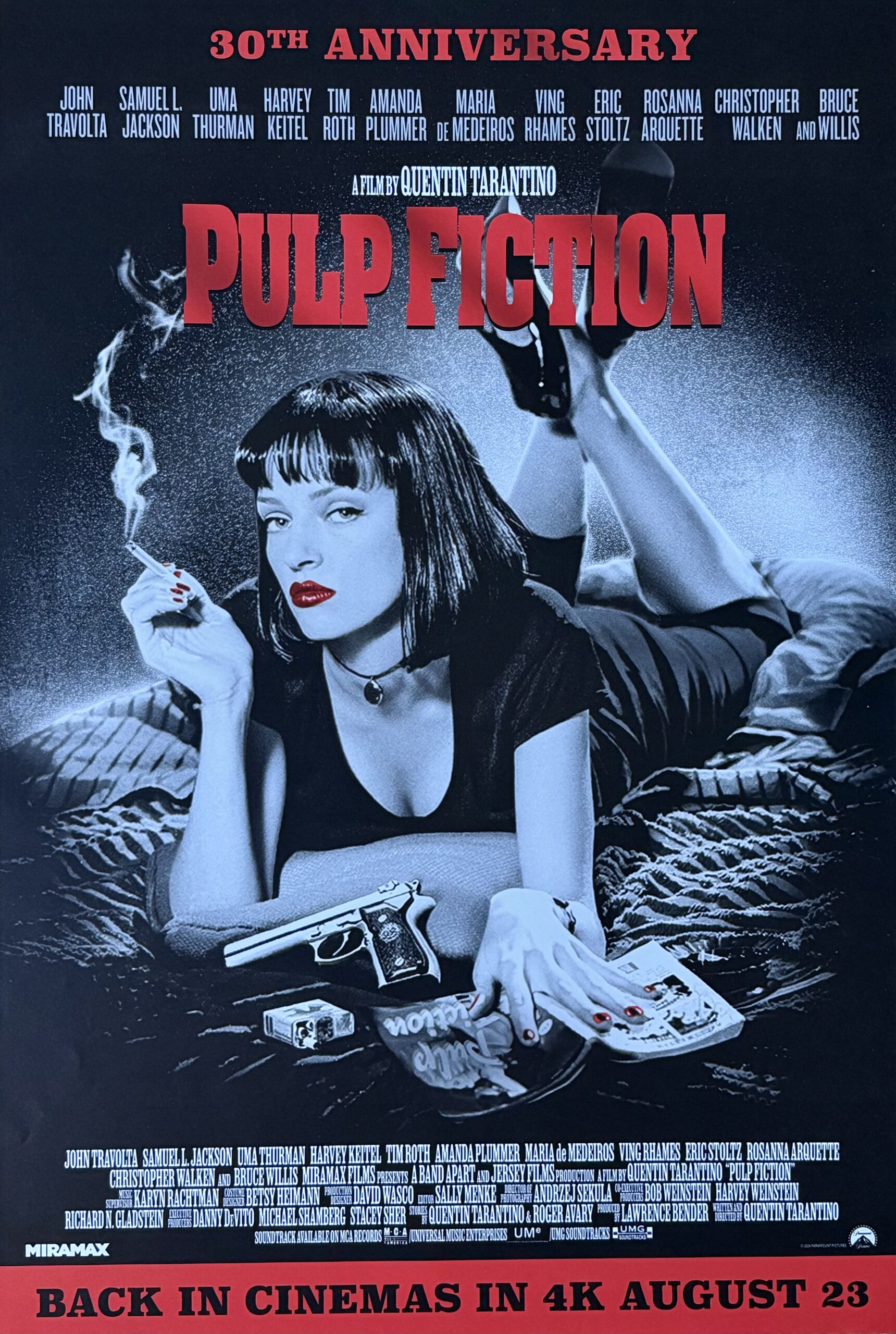 There is no doubting the influence and impact of Quentin Tarantino’s 1994 masterpiece “Pulp Fiction” and like so many of the Tarantino films the paper from each has become hugely collectable. The 30th Anniversary British one-sheet release offered here is no exception. This popular and most recognisable design by Indika Entertainment Advertising  has been adapted as a black and style with Uma Thurman’s bright red lips the perfect complement to the monotone imagery – truly striking and enhanced by the print quality and colour saturation. Very cool looking, and incredibly scarce, with only a limited release in a small number of cinemas. This is a fantastic original poster from Quentin Tarantino’s most celebrated film to date. Originally rolled (as issued) this totally unrestored example presents and displays to excellent effect and represents a hugely collectible piece of movie memorabilia from a truly iconic movie…“I do believe Marsellus Wallace, my husband, your boss, told you to take ME out and do WHATEVER I WANTED. Now I wanna dance, I wanna win. I want that trophy, so dance good.”