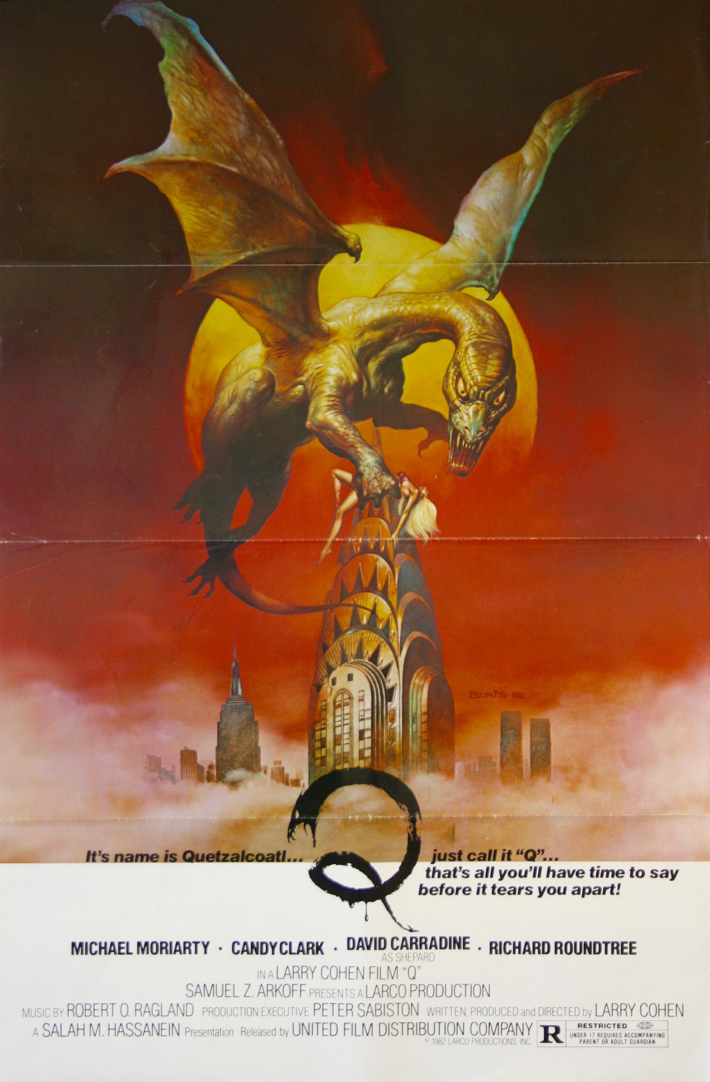 “Q The Winged Serpent“ is a trash movie classic, and it also represents one of the masters of that cinema niche’s finest hours. Larry Cohen directs this movie, which follows the standard monster movie formula, and is blended well with a theme of mass hysteria and a gritty New York setting. The plot for the movie is, of course, very simple and it sees two sets of murders being investigated by David Carradine‘s police detective. One set of murders is made up of ritualistic killings – people being flayed, having their hearts cut out etc. The other bunch of murders is more mysterious, and it sees things such as people having their heads bitten off, or being lifted from high rooftops, as if by a giant bird. Maybe there is simply a giant bird on the loose; or maybe those ritualistic killings have reincarnated an Aztec god known as Quetzalcoatl (or just ‘Q’ for short), which is currently nesting in one of New York City’s high buildings.