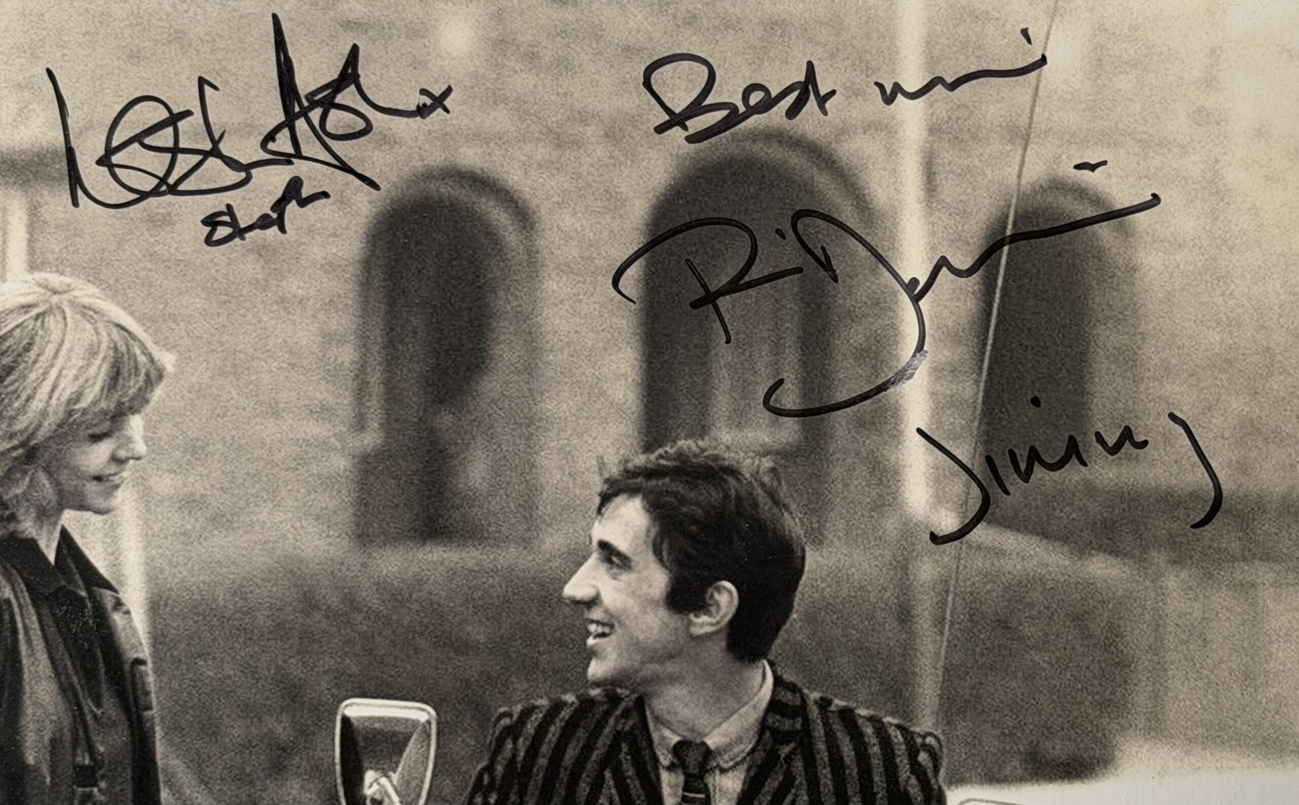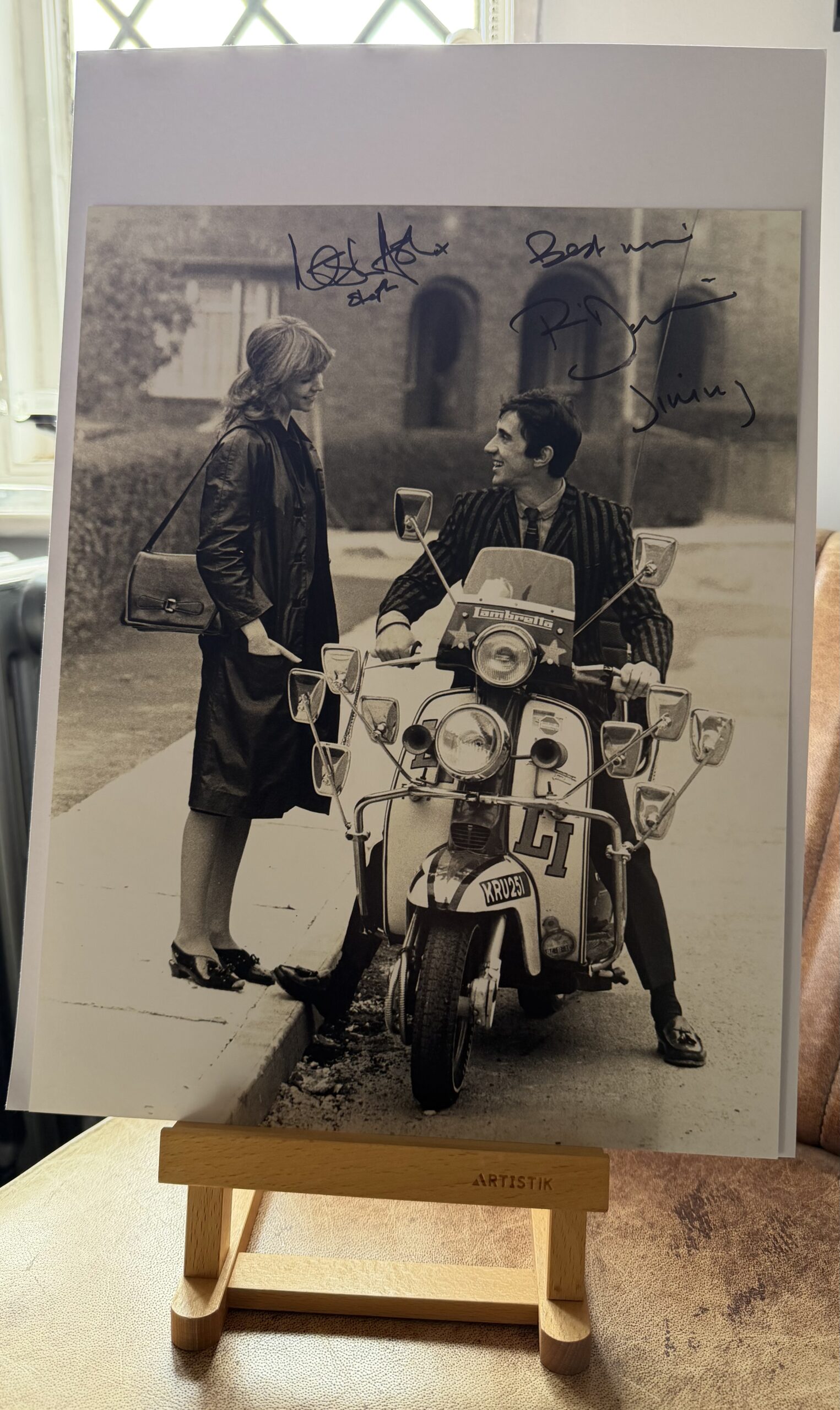 A double signed – Phil Daniels and Leslie Ash, over-sized photograph for Franc Roddam’s classic snap-shot of 60’s life “Quadrophenia”. Voted the 35th greatest British film of all time by “Total Film”. It has been cited as a major influence on the mod revival in music and fashion of the early 1980’s. This superb autographed example is excellent condition and has been signed by two of the stars – LESLIE ASH and PHIL DANIELS, with both adding their character name to their signatures – Steph and Jimmy. Leslie Ash’s signature was obtained in person on April 6th at London Film Fair, 2025 with Phil Daniels’ already present from a private signing. It’s a fantastic image of both actors and a great shot of Jimmy’s Vespa Lambretta. A real centre piece for any collection and a genuinely rare piece of very desirable British film / rock memorabilia…“Nothing seems right, apart from Brighton. I mean, Brighton was OK. Going to court with the Ace and that. And, like, I was a mod there, you know? I mean that’s something, innit, eh?”