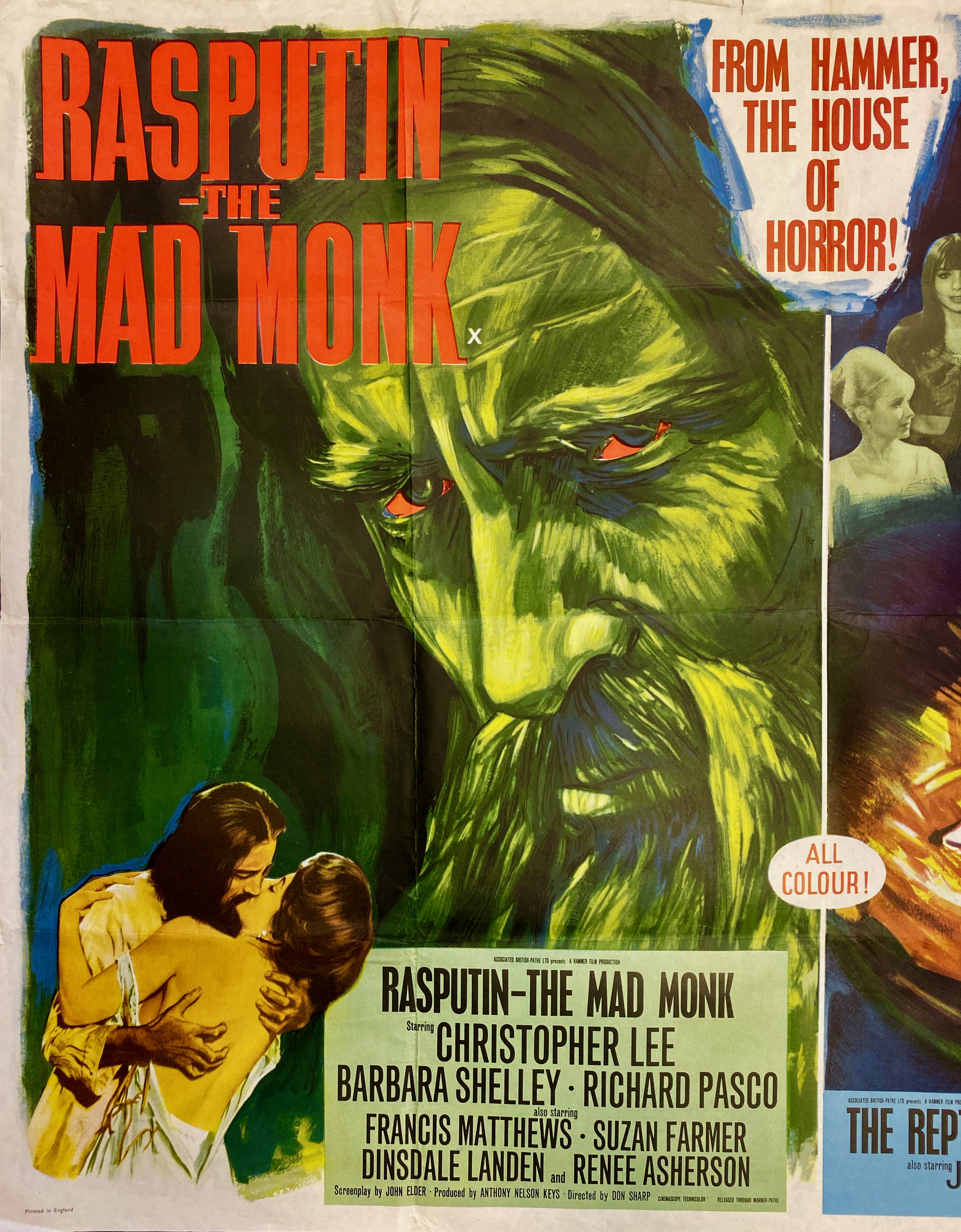 The tagline says it all “The House of Horror !”…The first time this much used phrase was used on a film poster and it was to become synonymous with the Studio. “Rasputin the Mad Monk / The Reptile” was released as a double feature in March 1966 and ranks as one of the best country of origin posters ever produced by Hammer. Whereas both standalone quads were produced in single colour this double bill offering is rendered in full blooded Hammer colour complemented with stunning artwork by Tom Chantrell…it truly is one of Hammer’s and artist Tom Chantrell’s best and most memorable posters. Originally folded (as issued) this marvellous unrestored item has stood the test of time very well and displays to very good effect with beautiful deep rich dark colours and eye-popping graphics. In my opinion one of the finest examples of British movie poster artwork ever produced; a real personal favourite and a fantastic investment condition piece of highly desirable original film movie memorabilia that rarely comes to market.