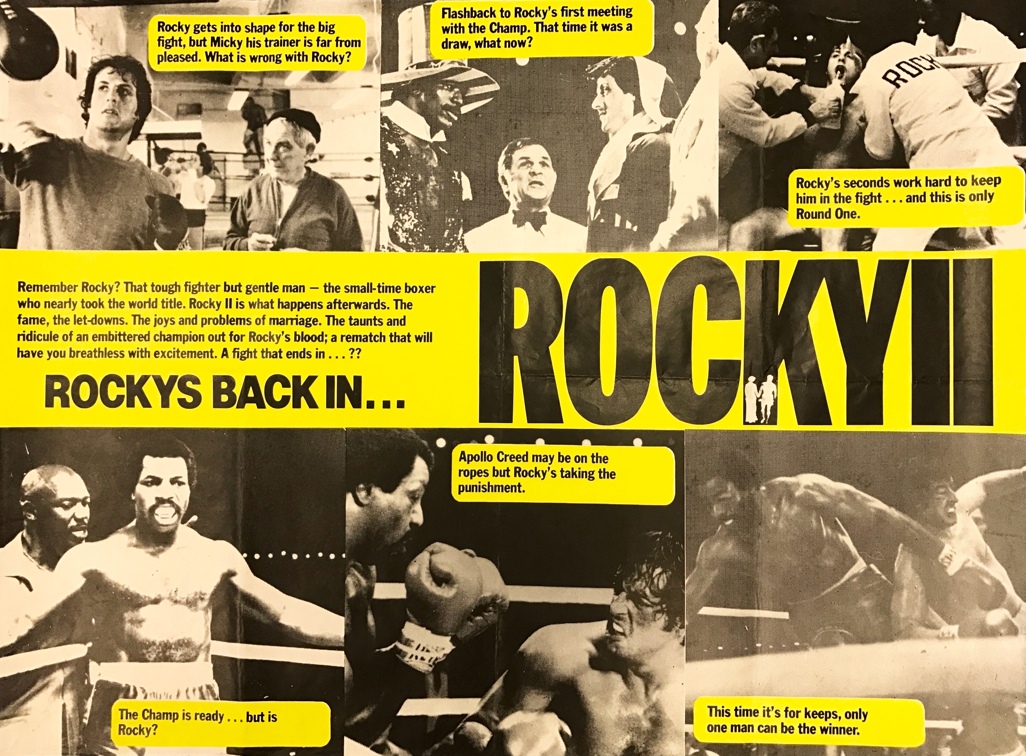 A rare style of film poster for the 1979 heavyweight sequel “Rocky II”. Produced exclusively for the Odeon chain of cinemas offered here is an original Marler Haley main design UK quad. Full of energy & emotion it is made up of an incredible series of black & white images of Stallone, Carl Weathers and Burgess Meredith. Posters for the much loved sequel are genuinely scarce with this example being presented in exceptional investment grade condition. Totally original and unrestored this folded (as issued) example displays and presents to excellent effect with dark black background offset by the bright yellow detailing. A great looking original movie poster from one of Stallone’s best performances…GO ROCKY !
