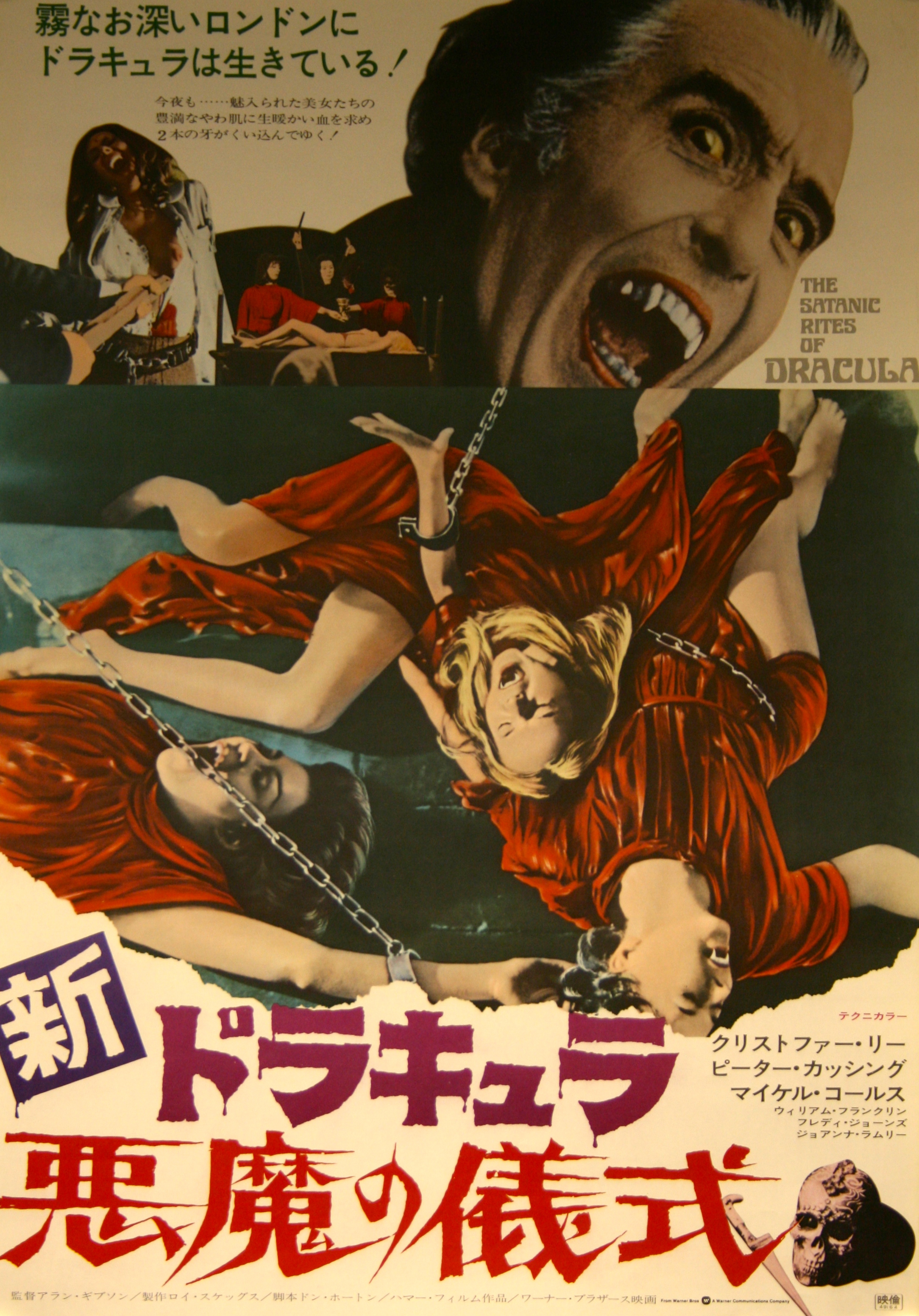 “My revenge has spread over centuries and has just begun!”…By the early 70’s Hammer Studios began making attempts to revitalize their by now trite’n’tired period Gothic horror formula with varying degrees of success. This enjoyably daft contemporary blend of horror, action and spy suspense thriller rates as one of their more engagingly offbeat efforts. Something sinister is afoot in modern swinging 70’s London. For starters, there’s a dastardly Satanic cult made up of wealthy businessmen and powerful politicians who participate in sick and kinky unholy rituals. Moreover, the leader of said cult is none other than Dracula (Christopher Lee, as fearsome and imposing as ever). Worse yet, brilliant, yet batty Professor Julian Keeley (a delightfully dotty Freddie Jones) has been commissioned by Dracula to create a virulent new strain of bubonic plague which could wipe out all mankind. It’s up to occult expert Professor Van Helsing (Peter Cushing in typically fine form), his comely granddaughter Jessica (a pleasingly perky turn by ravishing redhead Joanna Lumley) and stalwart Scotland Yard special agent Inspector Murray (dashing Michael Coles) to stop Dracula before it’s too late. Alan Gibson’s lively, stylish direction treats the outlandish premise with admirable seriousness and maintains a ceaseless barnstorming pace throughout. The action scenes and shock set pieces are staged with substantial go-for-it brio (the use of strenuous slow motion is especially striking and effective). Brian Probyn’s bright, sharp cinematography, the plentiful graphic gore, John (“Horror Express”) Cacavas’ funky, rousing, syncopated score, a smidgen of nudity, and sound acting from a tip-top cast all likewise hit the satisfying spot. Grood, groovy 70’s fright feature fun. Printed in Japan 49164