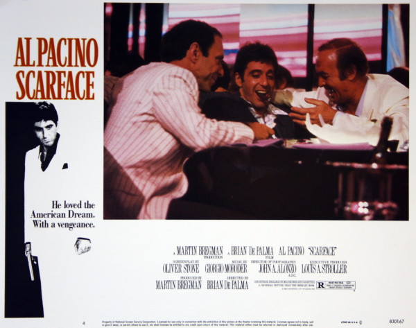 “…One of the greatest and most influential gangster movies of all time…Brian De Palma’s “Scarface”…Any memorabilia from this landmark film is extremely sought after and this original 1983 US lobby card #4 is no exception. Featured here a key scene as Tony Montana (Al Pacino) is starting out on his rise to the criminal hierarchy taking “advice” from mentor Frank Lopez (Robert Loggia) and the soon to be deceased Omar (F. Murray Abraham). This really is a superb example of rare film memorabilia from what has become Al Pacino’s signature role. True classic !…”I’m Tony Montana! You fuck with me, you fuckin’ with the best!”