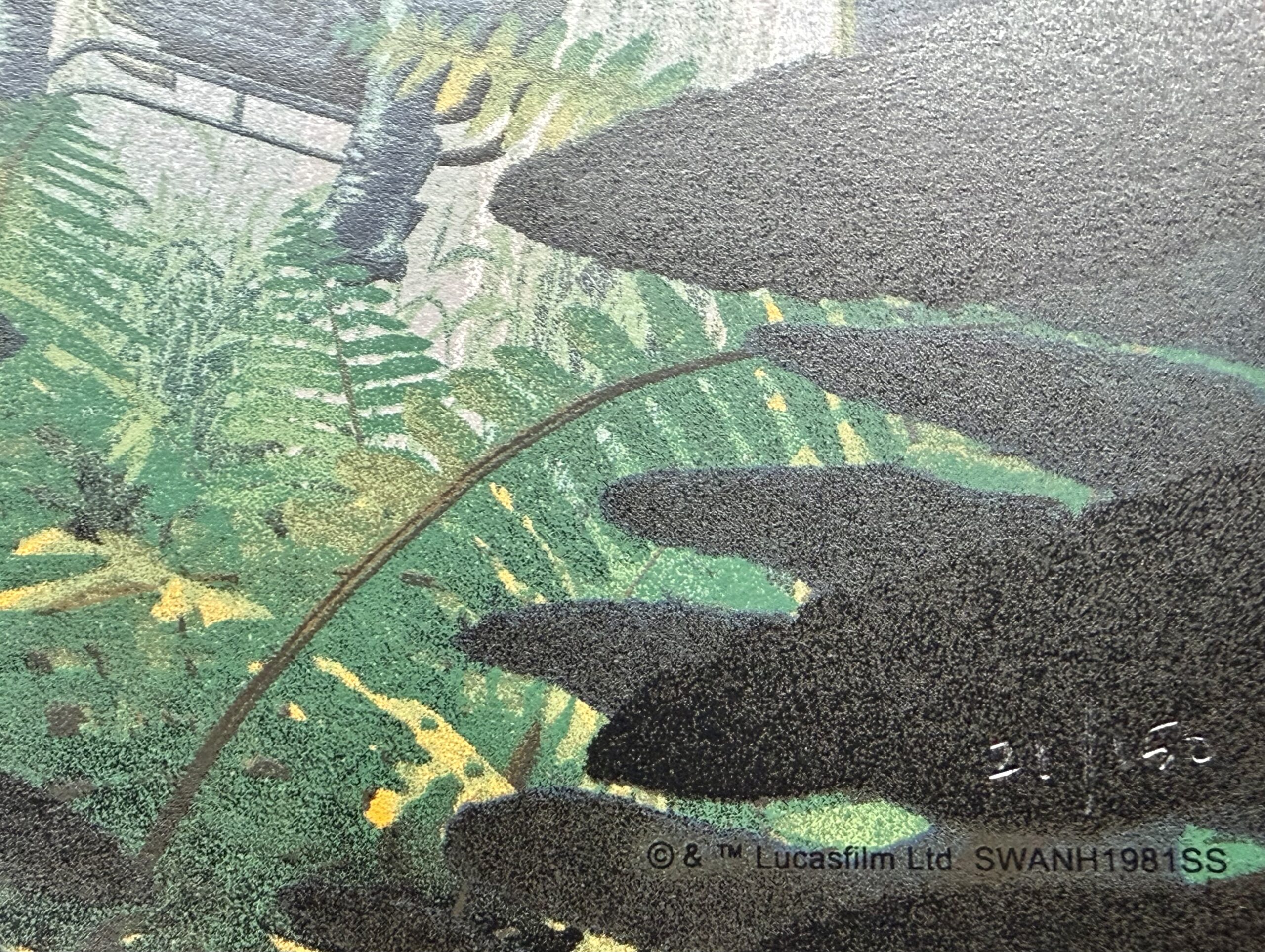 The third instalment of George Lucas’ original Star Wars trilogy Return of the Jedi” contains a number of incredible set pieces right from the opening scene in Bobba Fett’s lair, Han’s rescue by Luke, the reveal of a larger more deadly Death Star, the Ewoks and their home planet – the Forest Moon of Endor. And it the Forest of Endor that acts as the setting to one of the most exciting and adventurous scenes in the movie as Luke and Princess Leia battle the Imperial forces on their speeder bikes. That scene is perfectly captured here by Jason Raish for his 2025 alternative movie poster, as a stormtrooper is chased through the Endor Forest, by Luke on their speeder bikes, blasters blazing. It truly is spectacular. Presented here in original rolled (as issued) condition this fantastic example has deep unfaded vibrant colour tones and displays to excellent effect. With an extremely limited release of only 150 this hand-numbered #21 is a truly scarce poster and highly sought after. Already firmly established as a fans favourite, this impressive art print represents a fine addition for any collector of movie posters or Star Wars fan memorabilia.