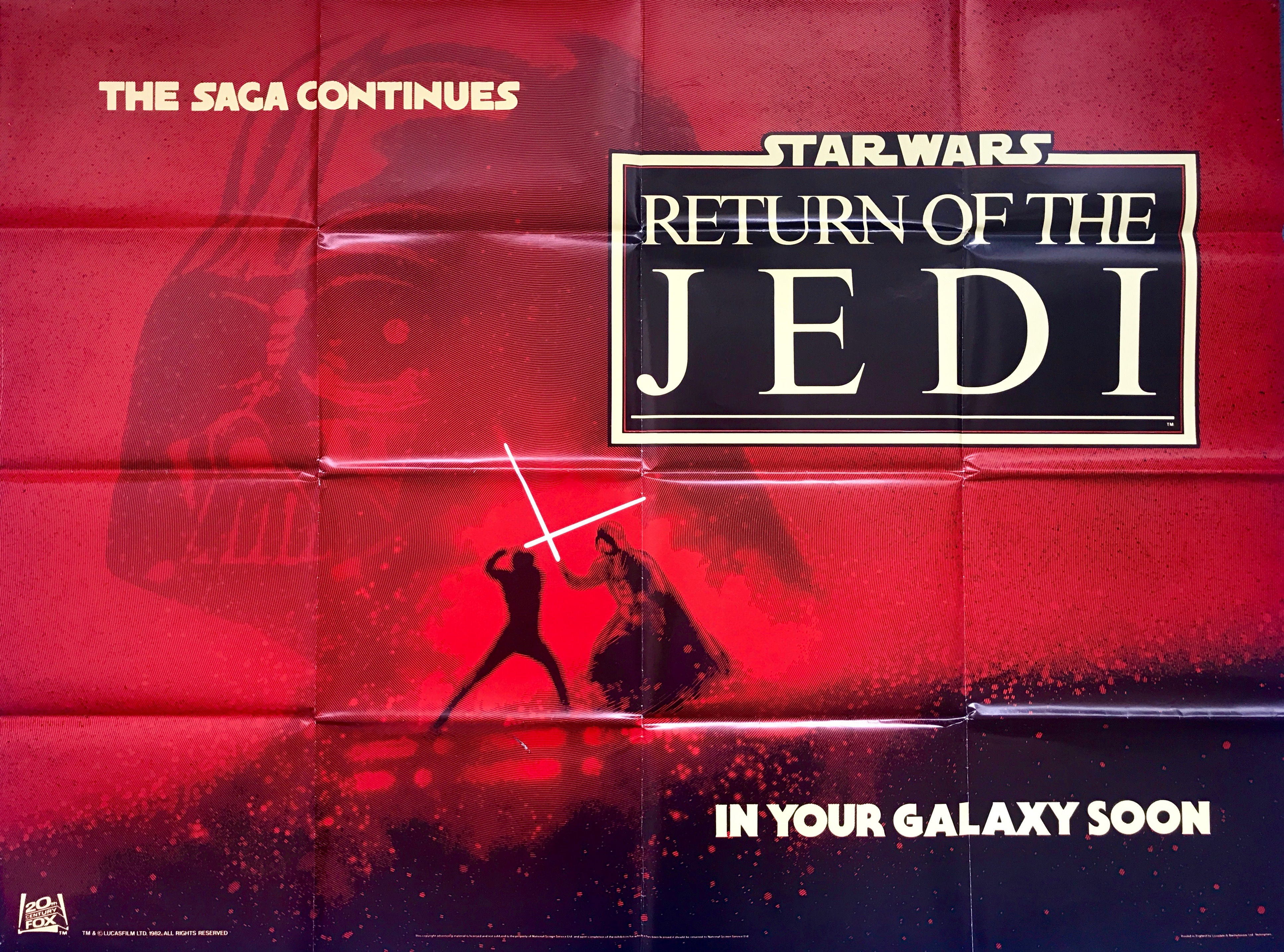 This poster has been given one of the highest rarity rating by the industry bible for Star Wars posters…Stephen Sansweet’s aptly named “Star Wars Poster Book. Featuring Drew Struzan’s awesome “Revenge” artwork this is an original Advance ‘The Saga Continues…In Your Galaxy Soon’ 1982 British quad film poster for “Episode VI: Return of the Jedi”. Beautiful deep unfaded colours and presented in totally original and unrestored folded (as issued) condition from what was the “last” true Star Wars movie until “Episode VII: The Force Awakens” lightened our darkness…A truly scarce example of extremely sought after and collectable original Star Wars movie memorabilia.