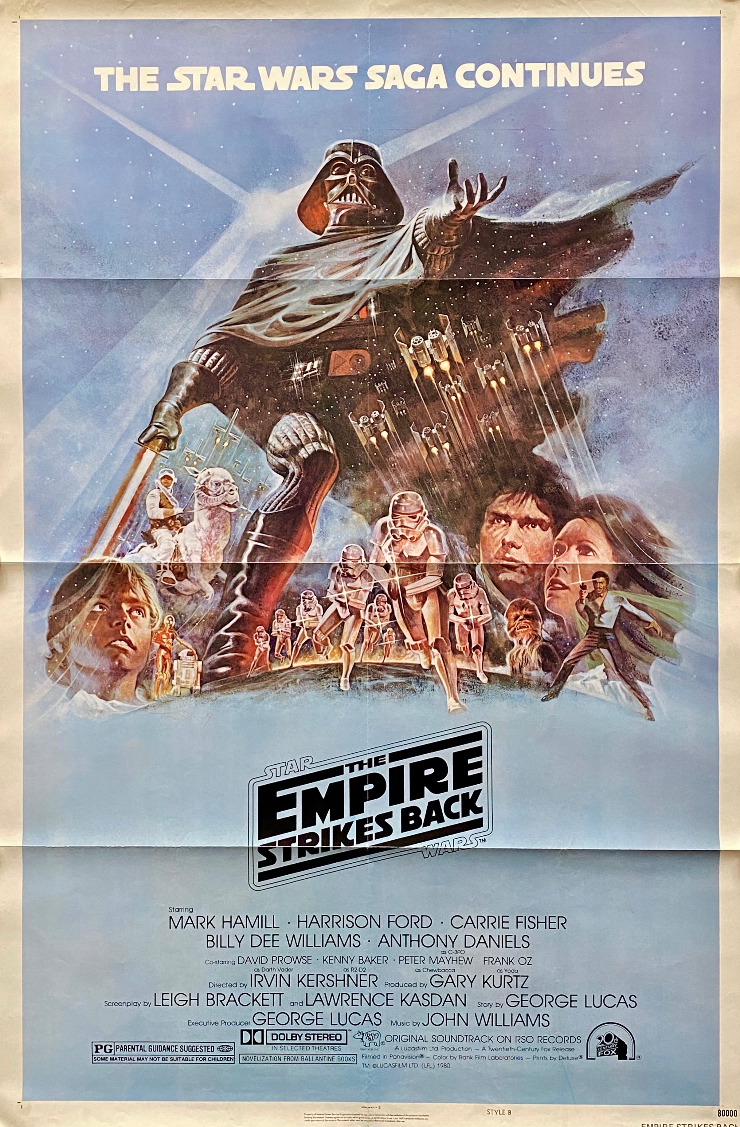 Absolutely beautiful, original unrestored 1980 US one sheet movie poster for the George Lucas sci fi classic sequel “Star Wars: The Empire Strikes Back”. This final release style B design features Tom Jung’s superb painted artwork highlighted by an incredible image of Darth Vader (so pivotal in this instalment of the franchise) looming large over our heroes. Being originally folded (as issued) this poster displays and presents to a very high standard with deep rich unfaded colours and represents a fine addition for any collector of original movie posters or Star Wars fan memorabilia.