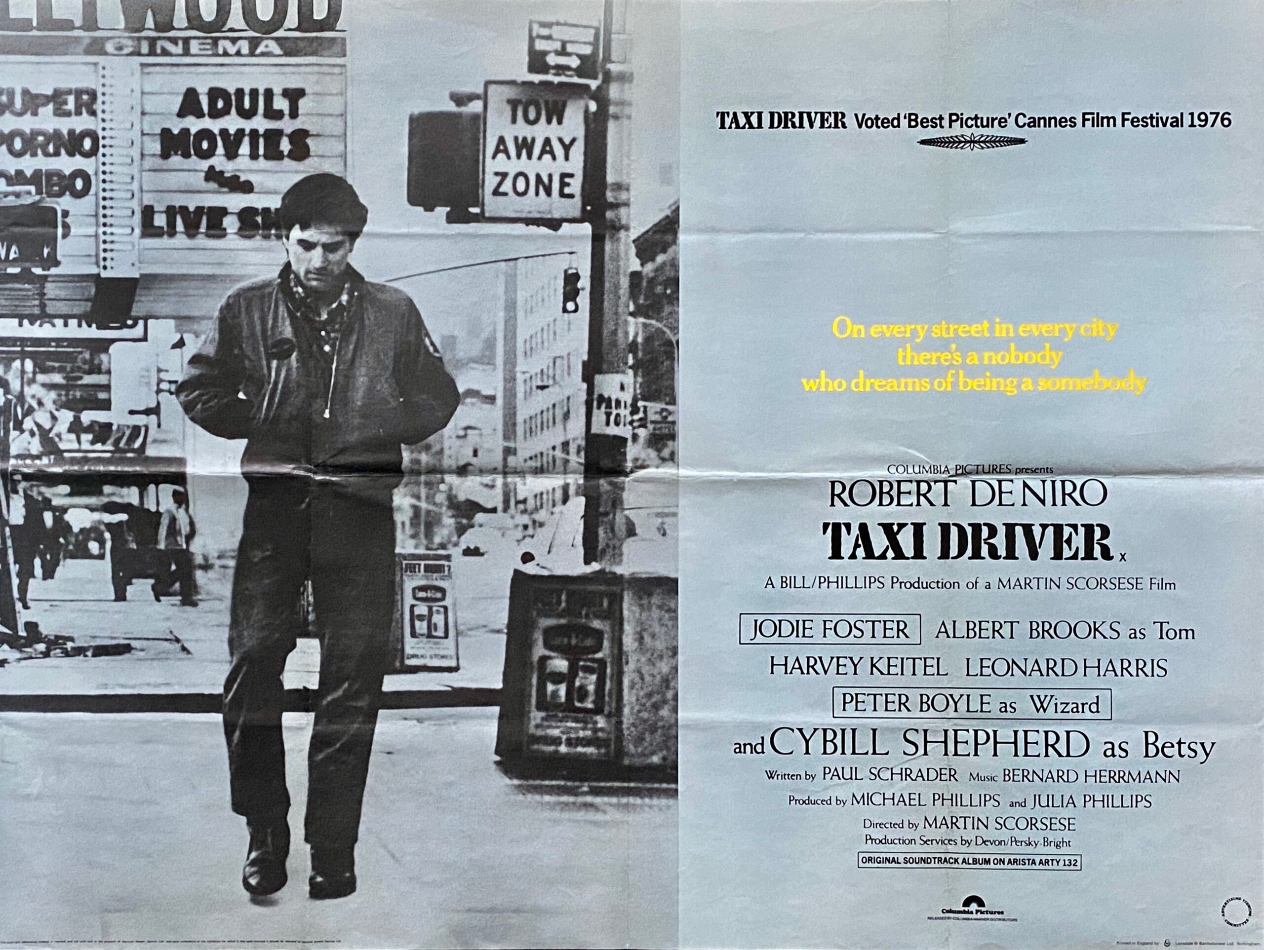 “Taxi Driver” has become a classic multi award winning pop culture cult phenomenom. This original British UK quad film poster is from first year of release 1976 and features the iconic image of ‘taxi-driver’ Travis Bickle (Robert de Niro) on the mean streets of New York. A true classic poster with this design being used for the European and British advertising campaigns. Originally folded (as issued) this beautiful unrestored example displays and presents to excellent effect and really is an exceptional item that represents an extremely collectable original movie memorabilia from a film that is rightly regarded as one of the finest ever made.