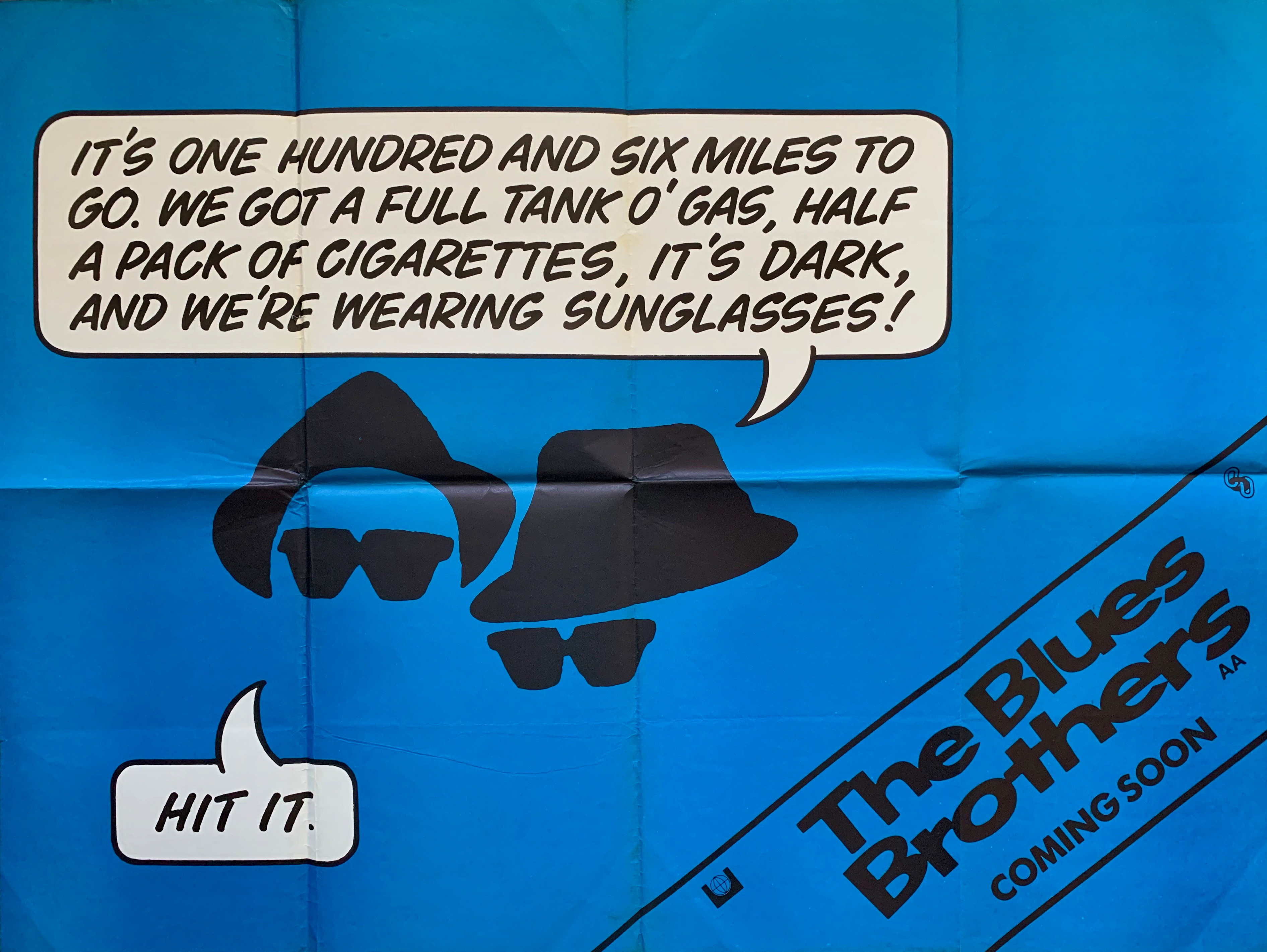 One of the few films that truly deserves to be called a ‘classic’. John Landis’ 1980 action comedy rollercoaster “The Blues Brothers”.  Over the years this movie has built up a huge cult following and established itself as the benchmark for which other action comedy films are compared against; it’s not many that come close. Any paper from the original release is extremely scarce and very desirable, but this is an incredibly scarce Advance Teaser UK quad design and these very rarely come up for sale. The original UK quad film poster offered here features Elwood’s (Dan Aykroyd) classic line “It’s one hundred and six miles to go, we got a full tank of gas, half a pack of cigarettes, it’s dark… and we’re wearing sunglasses” offset against bold blue background with black caricatures of both Blues Brothers – Jake (John Belushi) & Elwood (Dan Aykroyd). Originally folded (as issued) it displays very well and is a fine example of very rare original and collectable movie memorabilia for the screens best loved anarchic action musical comedy that is “The Blues Brothers”