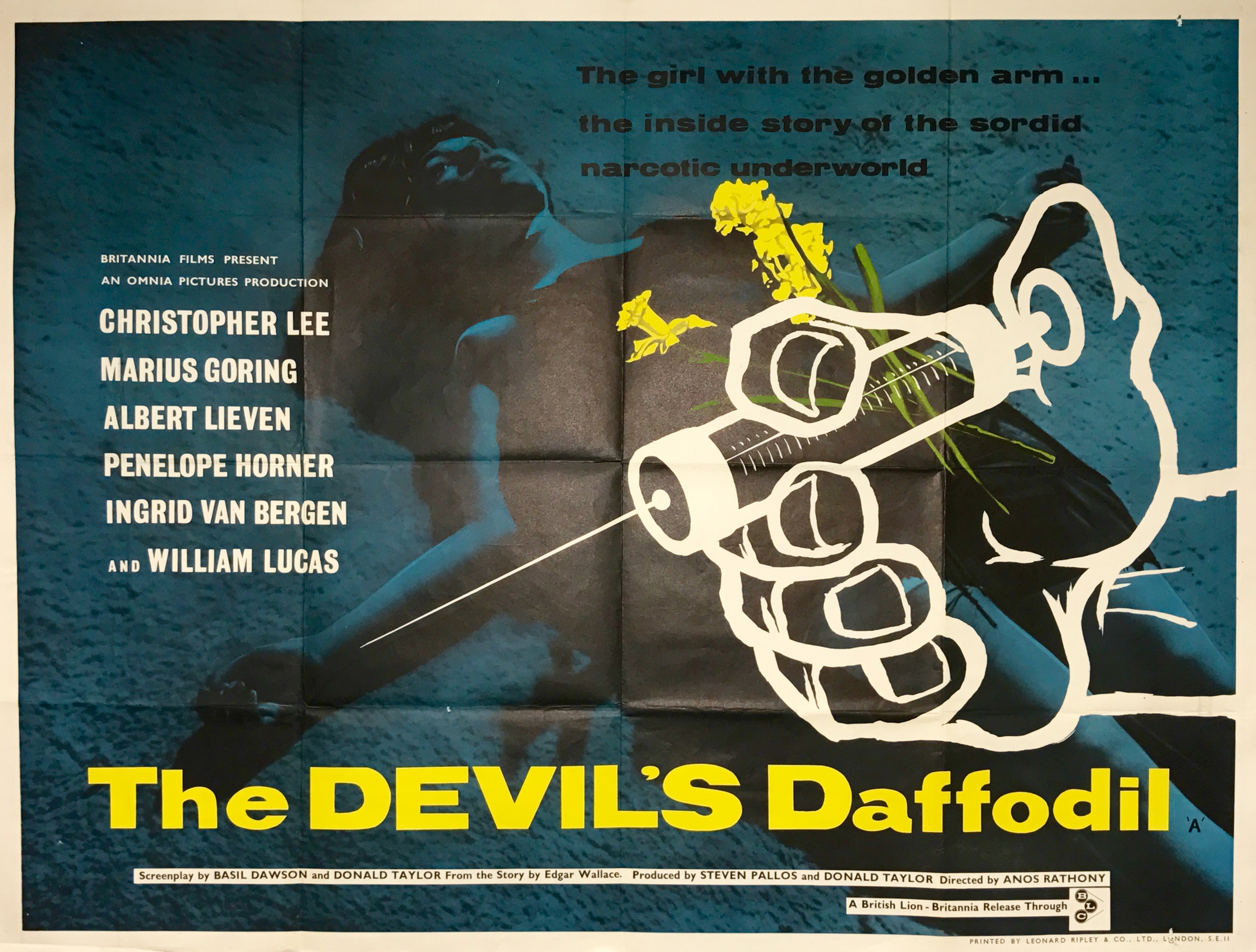 An incredibly rare UK quad film poster for the British / German co-production of “The Devil’s Daffodil”. Released in 1961 the UK design and artwork is particularly striking with a heavy ‘drug’ influence; hugely controversial for the time. Originally folded (as issued) it is totally unrestored and displays and presents to very good effect effect with minimal handling and age wear, clever use of block colour and striking stylised design that is an obvious nod to American poster designer Saul Bass. Scarce and desirable this is an excellent example of original, great looking movie memorabilia.