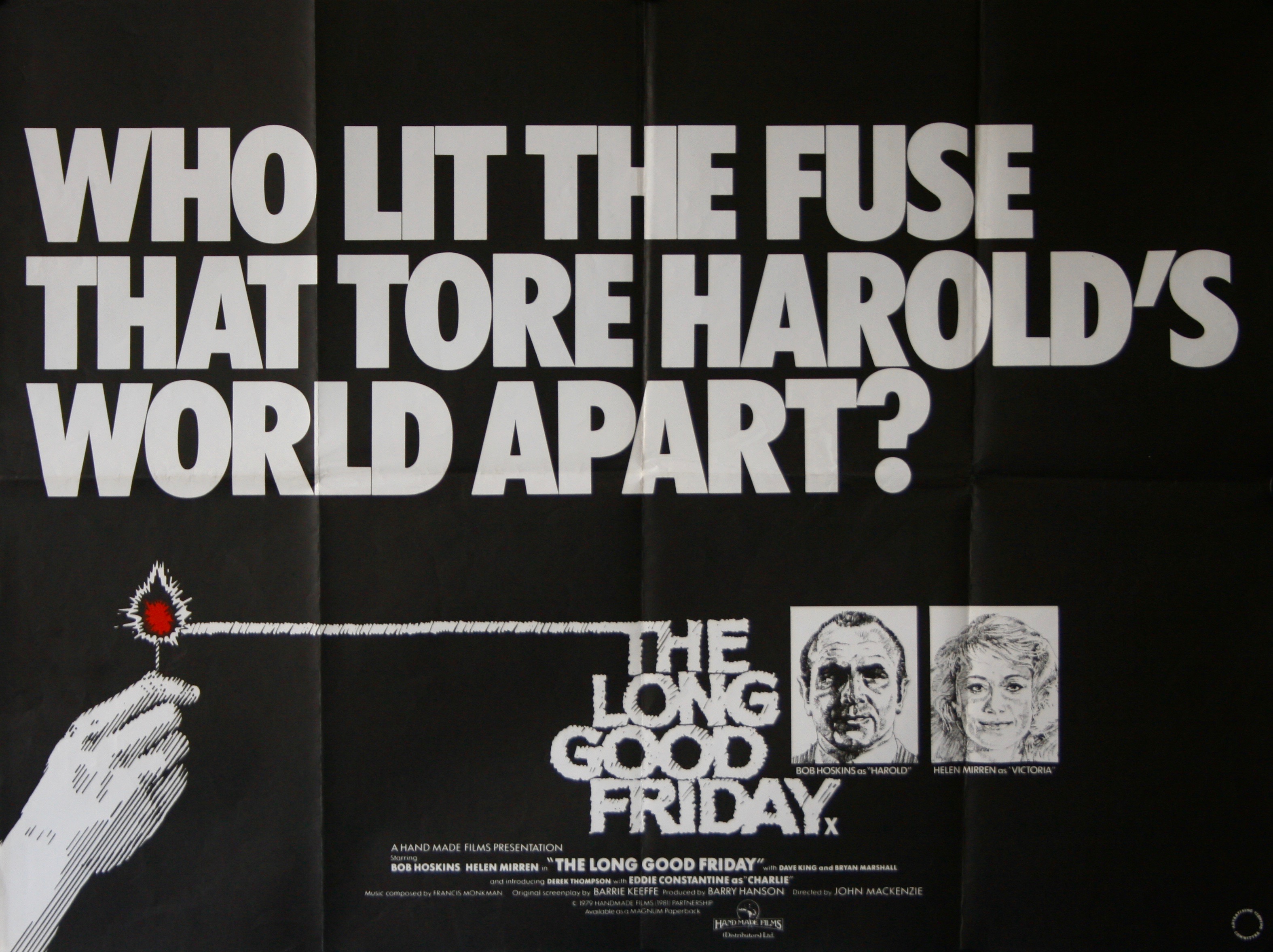 A critical and commercial success and perhaps the best British movie (gangster or otherwise) ever made…John MacKenzie’s “The Long Good Friday”. Receiving a very limited release in UK cinemas (it was nearly never released due to financial problems & only saved as a cinematic production by George Harrison, with his Handmade Films stepping in at the 11th hour) meant that any paper is scarce, making this original 1980 UK quad film poster a rare find especially in such high grade condition. Featuring stark black & white country unique design & artwork this excellent unrestored example presents near perfectly. Folded (as issued) it represents an exceptional piece of collectible original film memorabilia from a true British gangster classic…“The Mafia? I’ve shit ’em”