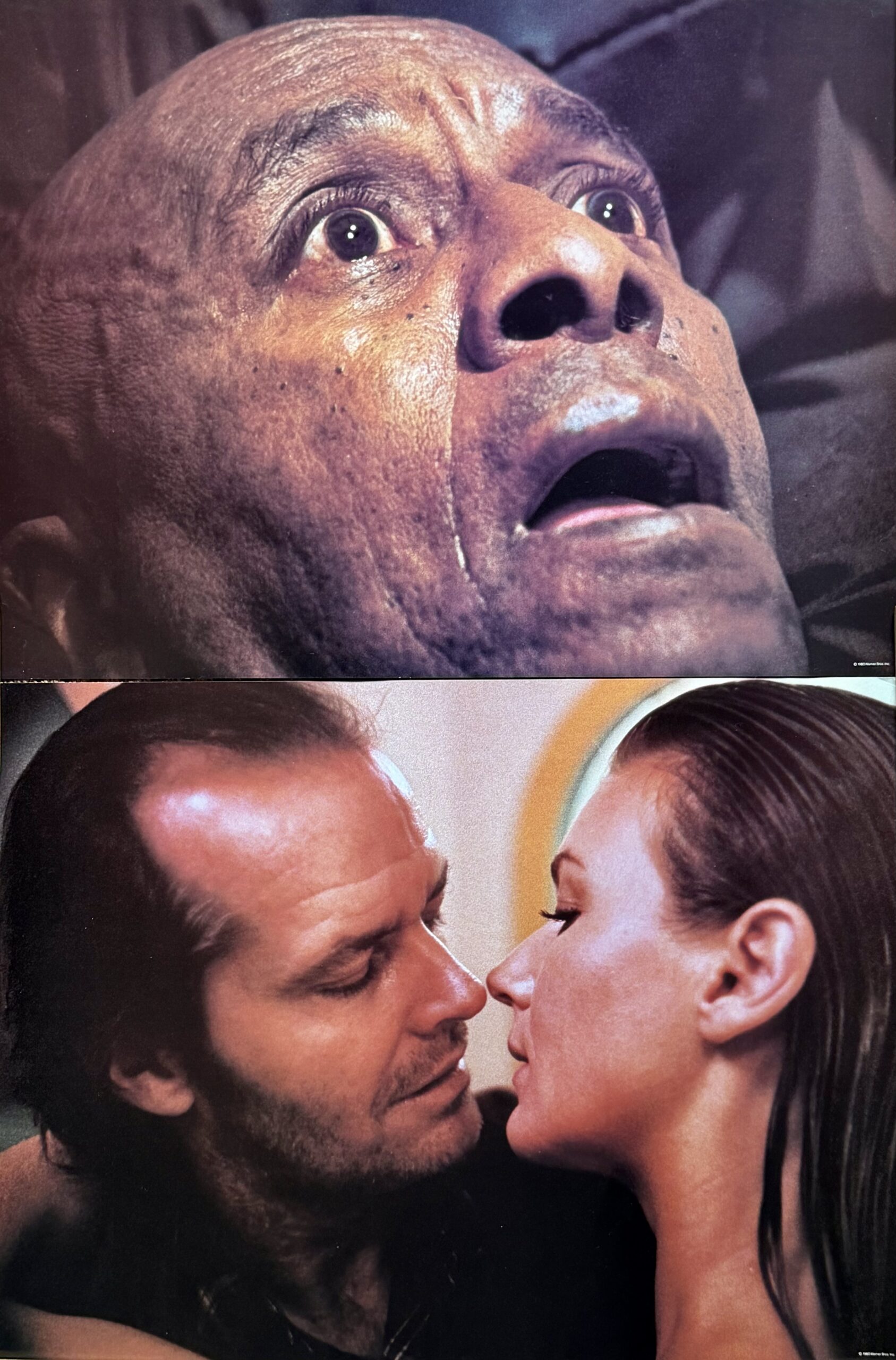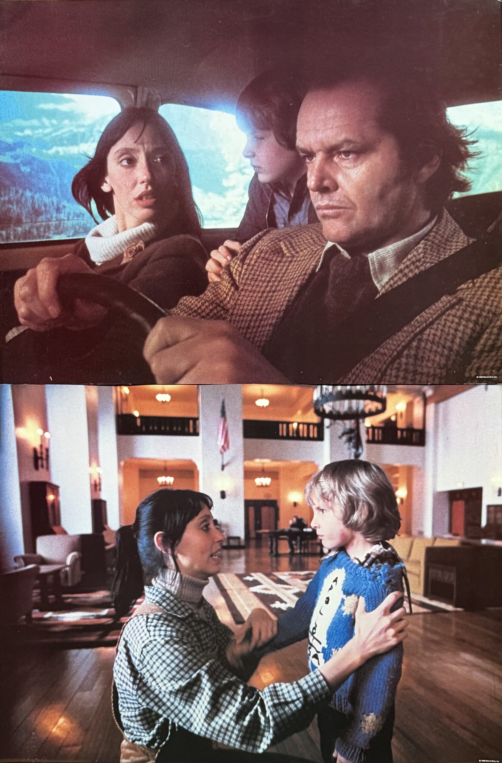 Marketing and multiple examples of promotional items are a trademark of Kubrick’s films and just when you think you have seen it all, something new shows up. A beautiful, complete set of all eight US over-sized (15″ x 20″ – 38 x 51 cm), full colour stills from first year of release, 1980 for Stanley Kubrick’s masterpiece of modern horror “The Shining”. These full-colour, full bleed (the imagery runs right to the edge with no border) cards comprise a series of incredible character and key scene imagery, that includes two from the iconic ‘Here’s Johnny’ moment with six in total to feature ‘mad’ Jack Nicholson. A rare find as a complete set as most were broken up and the cards sold individually. Totally original and unrestored, the cards are presented in high grade flat, unfolded (as issued) condition that display and present to excellent effect and even more impressive because of their larger size and hi-gloss finish. A genuinely scarce and hard to find example of horror film cinema memorabilia for one of the most important and influential horror films ever made.“All work and no play makes Jack a dull boy…”