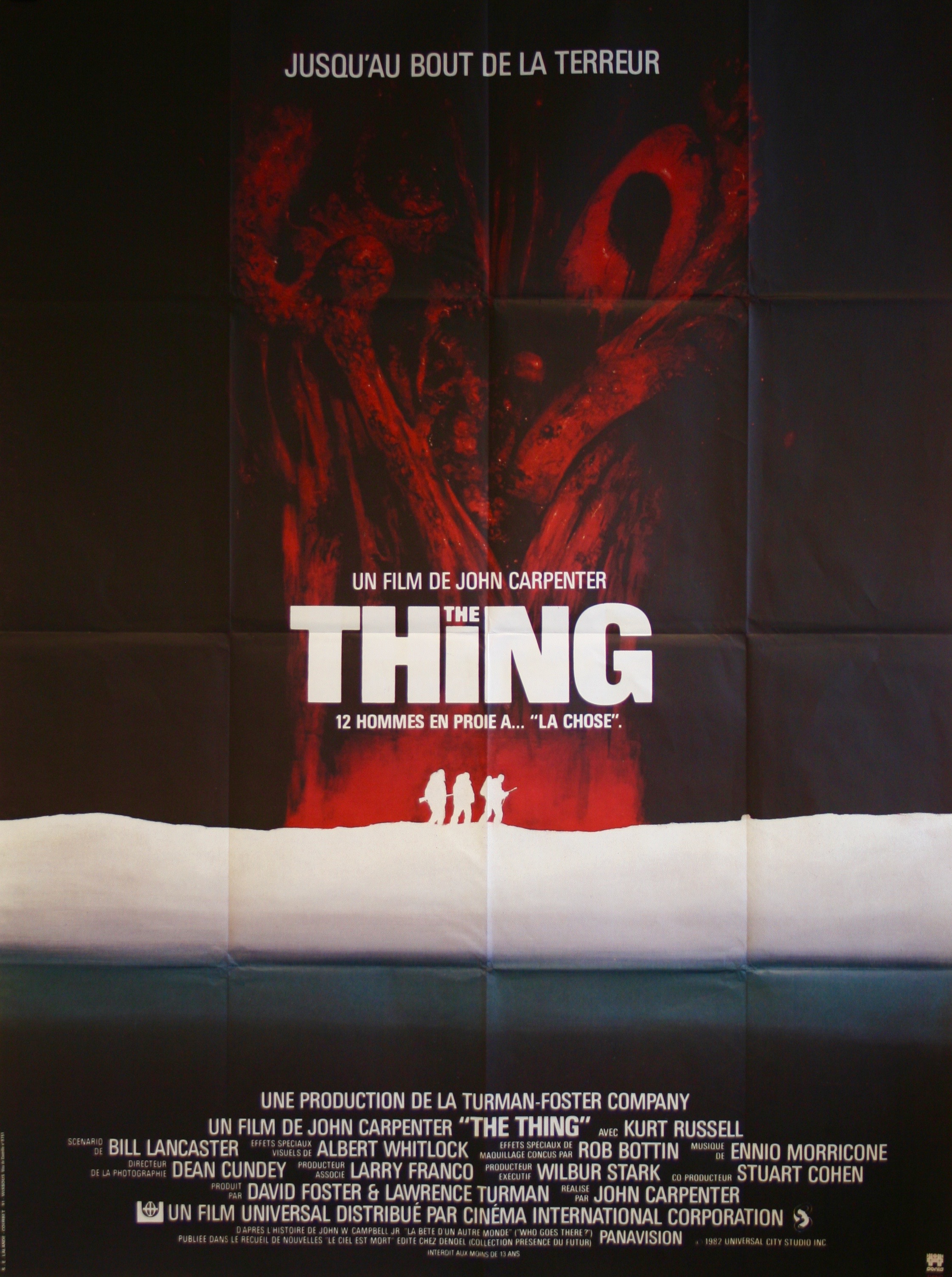 Without a shadow of doubt easily my favourite John Carpenter film and certainly a movie that makes my own personal top 10. This original The Thing French Grande Affiche movie poster features country unique design with a nod to the excellent UK quad imagery by Les Edwards that was so successful that it’s central theme and imagery were used as a basis for the Worldwide advertising campaign; notably France, Japan & Italy only the USA used different artwork (another great poster by Drew Struzan)…The original 1982 French Grande Affiche film poster for John Carpenter’s classic The Thing offered here was originally folded (as issued) & presents in exceptional original unrestored condition with great colours and deep unfaded black background. Very rare in such fine condition and represents very collectable & desirable original film memorabilia from a film lauded as a classic of the genre that in this large format is sure to impress.