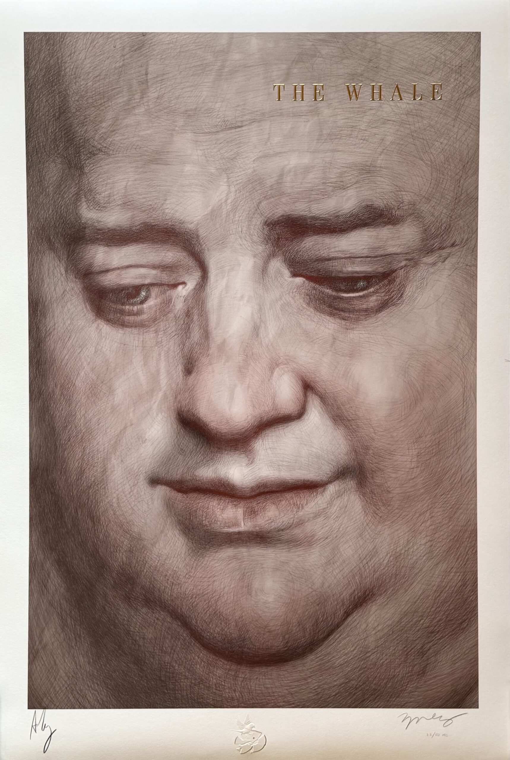 James Jean had this to say on the commission – “After Darren screened The Whale for me last year and asked me to create its poster, I immediately thought of Lucien Freud’s paintings of Leigh Bowery, and Kiki Smith’s self portrait, My Blue Lake. In the latter, Smith used a special camera to capture the periphery of her torso, resulting in an image that reads like a topographical map of her skin. While drawing Charlie (Brendan Fraser), I tried to channel Freud’s intimate yet unforgiving observations of Bowery. The depth of Charlie’s grief in the film is manifest in the expansive landscape of his body, barely able to contain all the feeling within. The skin is but a thin boundary between the external and internal worlds. In my drawing, his pain is full bleed and stretches beyond the margins, but his humanity and optimism breach the surface in the peaks and valleys of his face. A subtle texture of crumpled paper is embedded in the portrait, referencing the essay Charlie clutches in his hands throughout the film, an artifact from his daughter’s childhood that he cherishes for years and keeps him anchored away from the brink”