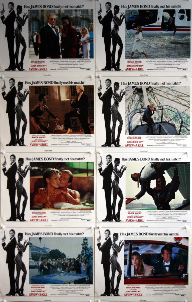 “Has James Bond Finally Met His Match”…”A View To A Kill” was Roger Moore’s final outing as 007 and sees him beautifully portrayed in this very rare Country of Origin (British) full set of 8 Lobby Card from 1985. Daniel Goozee’s artwork frames some memorable scenes including Bond putting his moves on Fiona Fullerton in a hot-tub and Grace Jones “May Day” about to kick the s**t out of the Movie’s chief baddie Zorin (Christopher Walken). This genuinely very rare British set is presented in excellent (probably unused) condition with only the most minimal of age and handling wear.