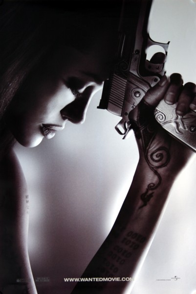 “Their world. Her rules. His destiny.”…Very rare (considering this film was only released in 2008) original Advance US One Sheet “Angelina Jolie” version for Timur Bekmambetov’s high octane actioner “Wanted”. Designed by the advertising agency Cold Open this extreme Angelina close up is one of the coolest looking posters of 2008.